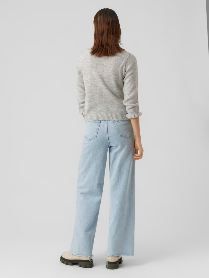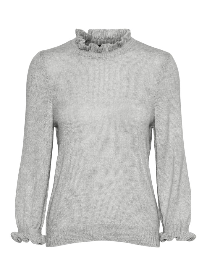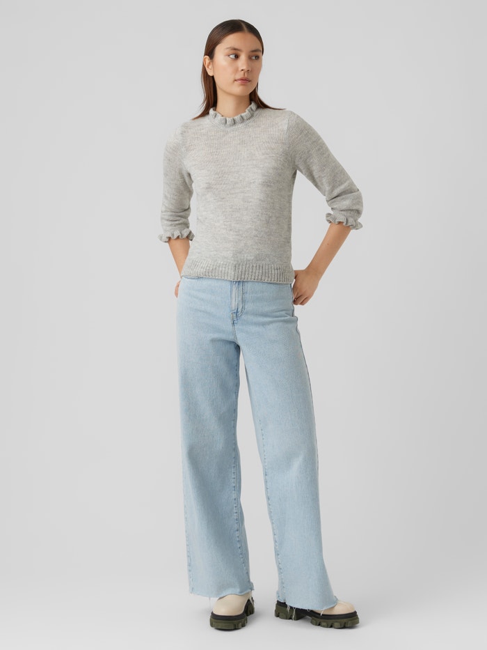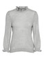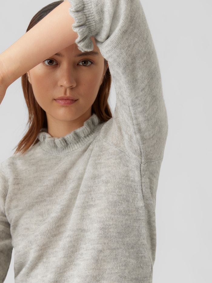 Knitted blouse with a rib structure at the bottom hem, feminine ruffles at the cuffs and neckline, and a high neckline. Style this comfy blouse with a high-waisted skirt, a pair of tights, and some long boots for a stylish everyday look.