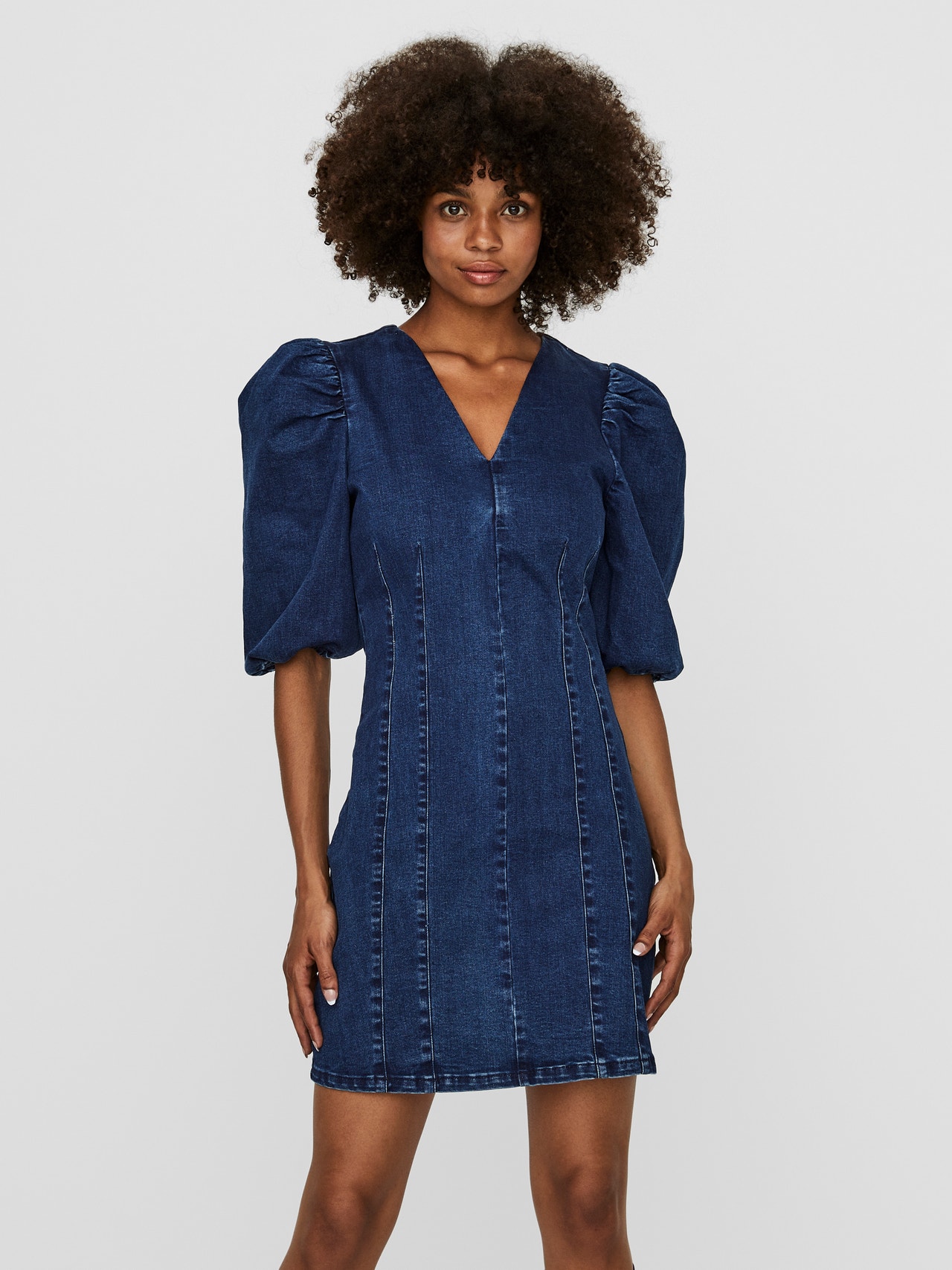 - Denim mini dress.