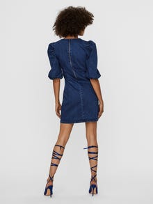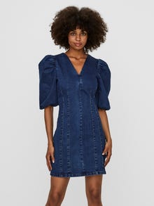 Denim mini dress with voluminous sleeves and zip closure in the back. The dress is made from a soft cotton blend material. Style it with boots for a trendy look.