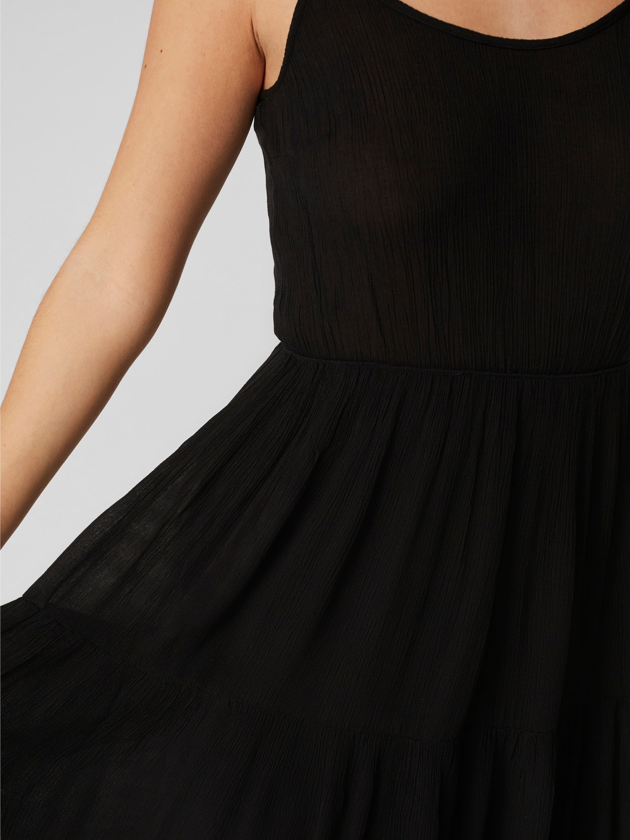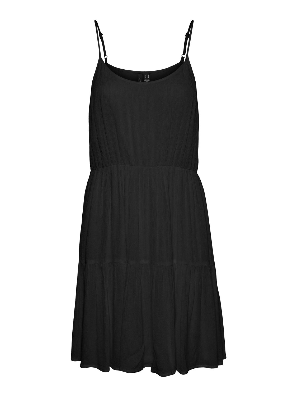 Short, singlet dress with horizontal cutlines in the skirt and thin, adjustable shoulder straps. Style this cute dress with some cool sneakers and an oversized, short shacket for a cool and stunning everyday look.