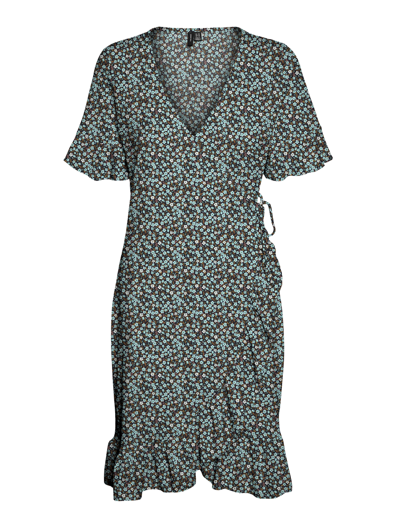 Wrap dress with frills at the cuffs and bottom hem, tie strings on the side, and a v-neckline. Style this cute dress with some feminine sandals and your favourite accessories for a charming everyday look.