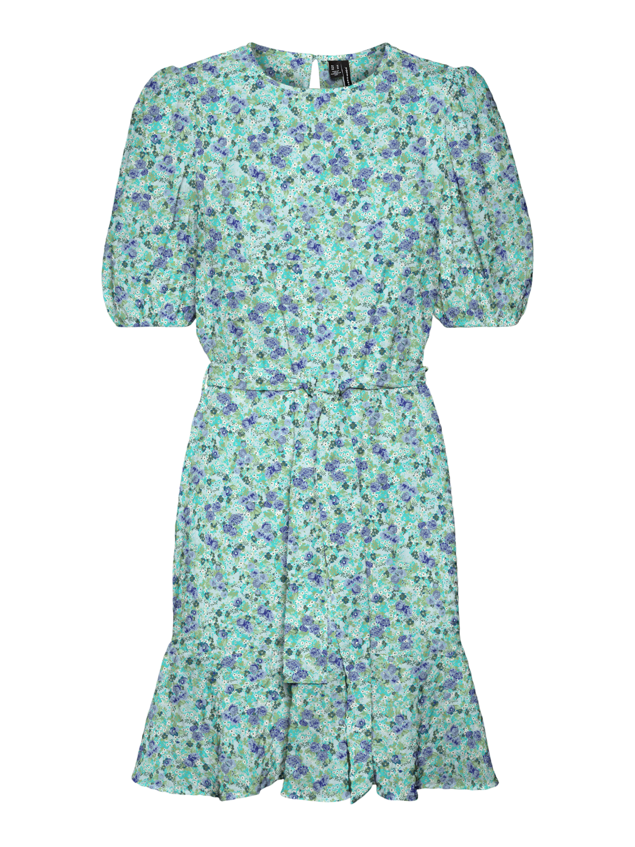 Mini dress with a tie-band at the waist, balloon sleeves, and ruffles at the bottom hem. Style this beautiful dress with a pair of sneakers and a light jacket for a cute go-to look.