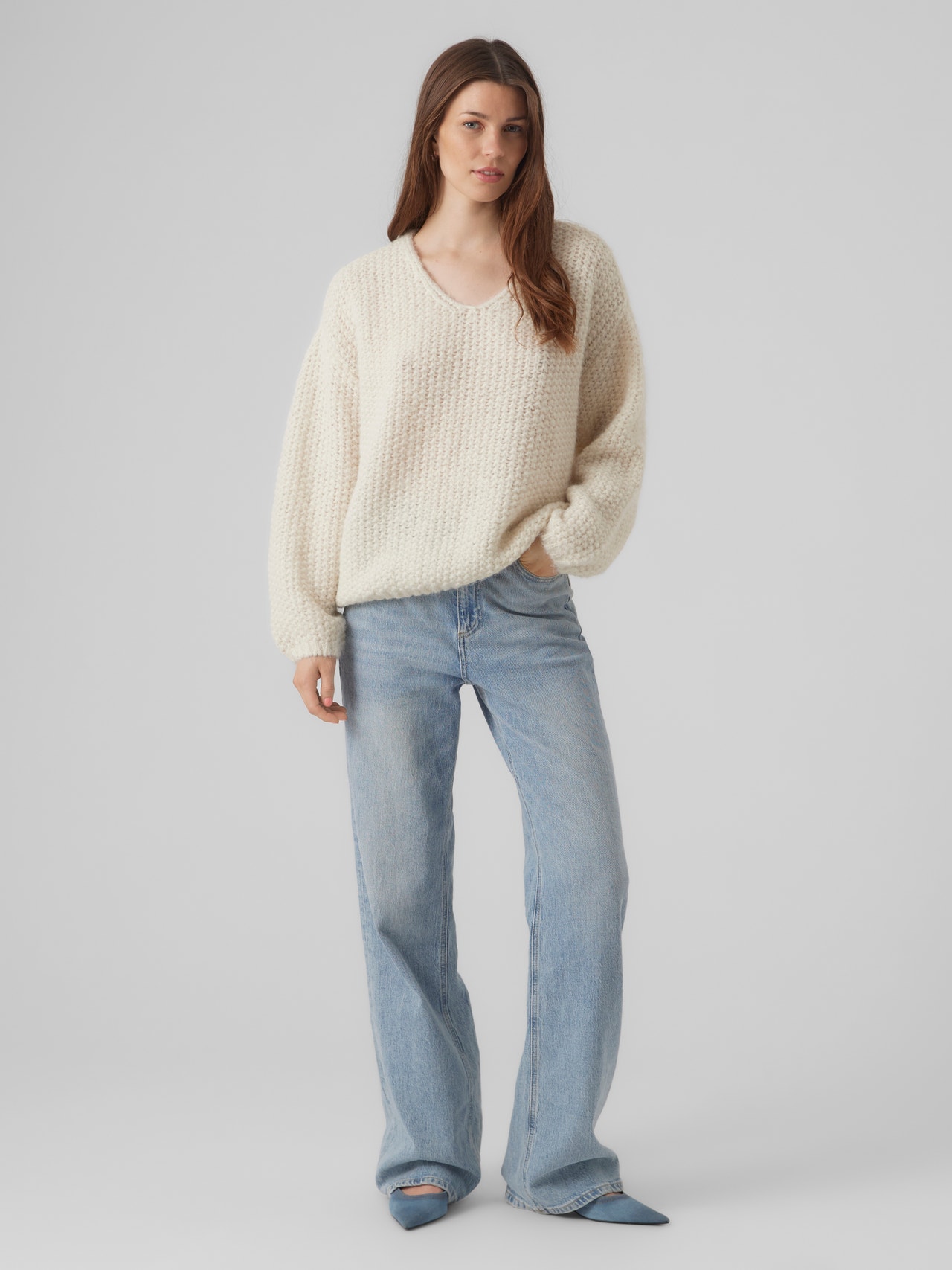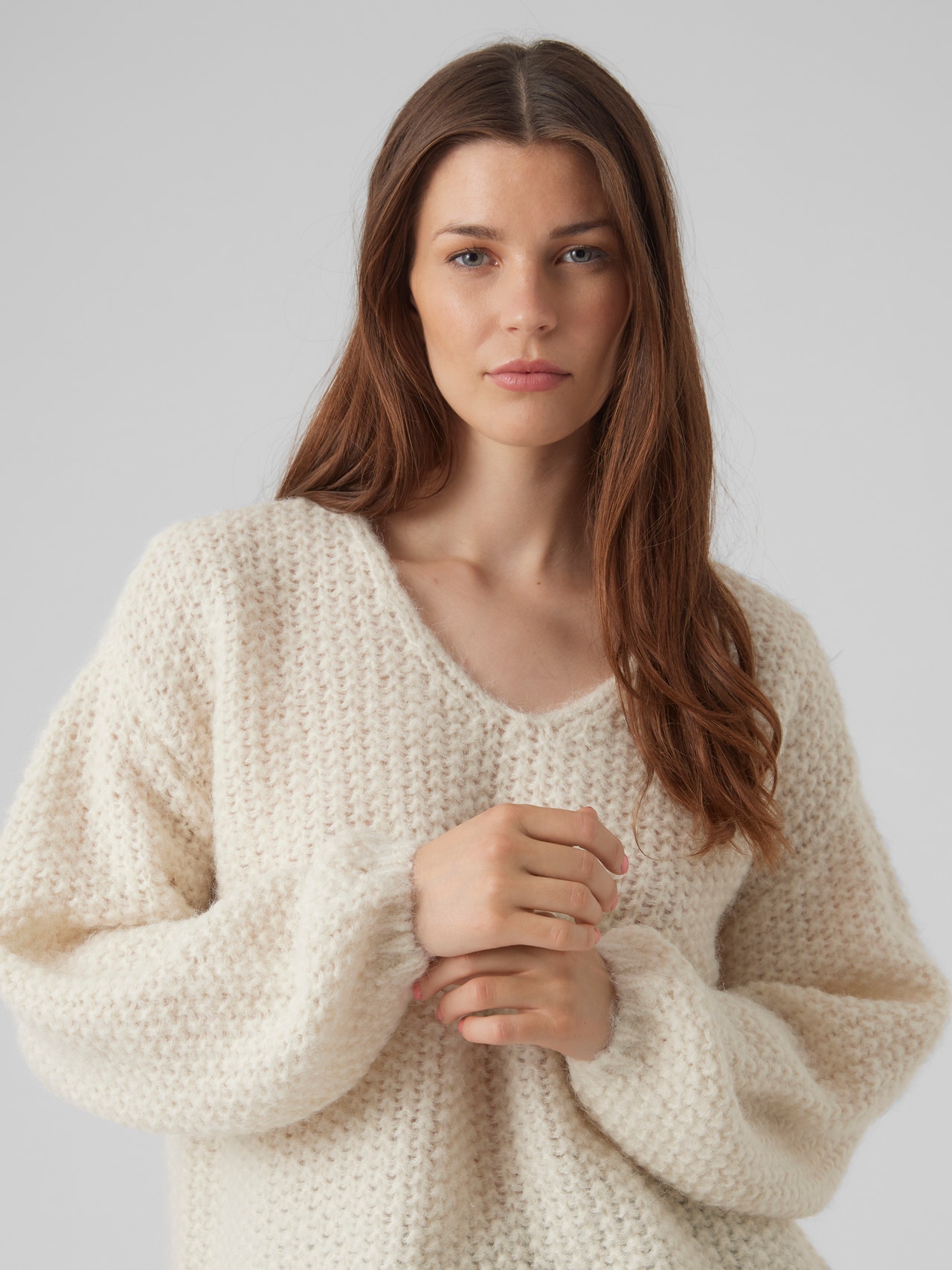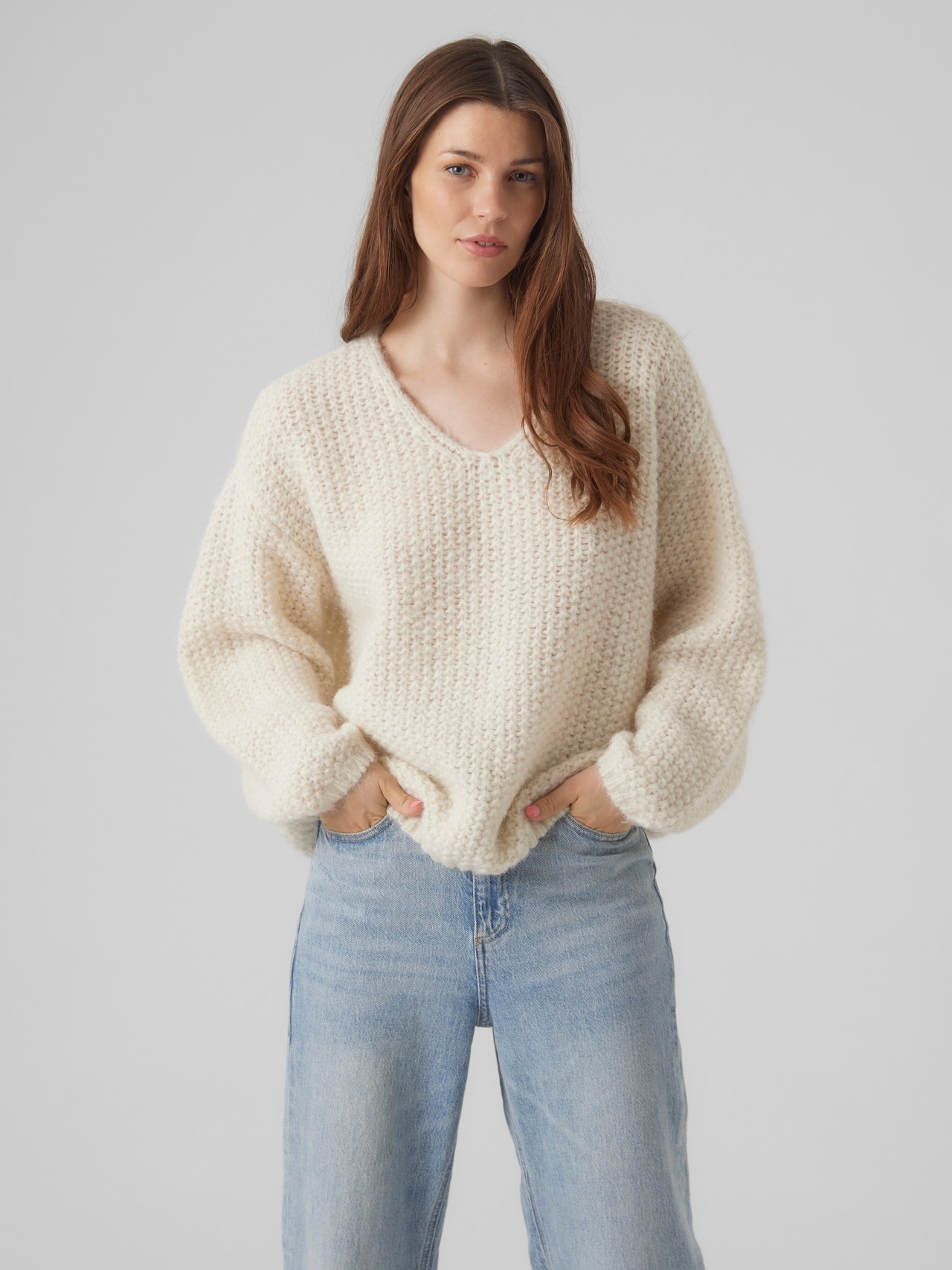 Denne vare vil blive en fast del af garderoben, der vil fungere på alle årstider og give dit look en komfortabel og behagelig stemning. Spørger du os, er en striktop en populær vare hele året rundt! Find den, der passer dig, og brug den med et par jeans. Psst... tilpas dine sko til sæsonen for at sikre dig, at du vil få opmærksomhed. - Produkttype : Striktrøje - Hals : V-hals - Ærme : Lange ærmer - Ærmer : Sænkede skuldersømme