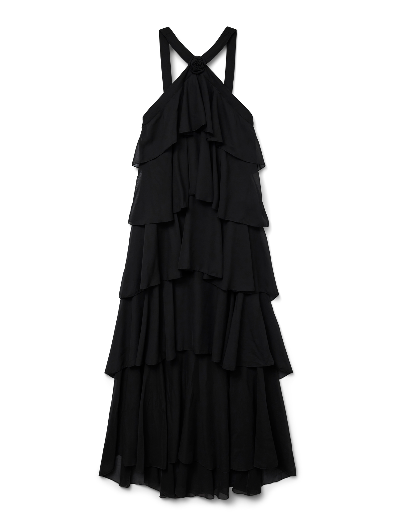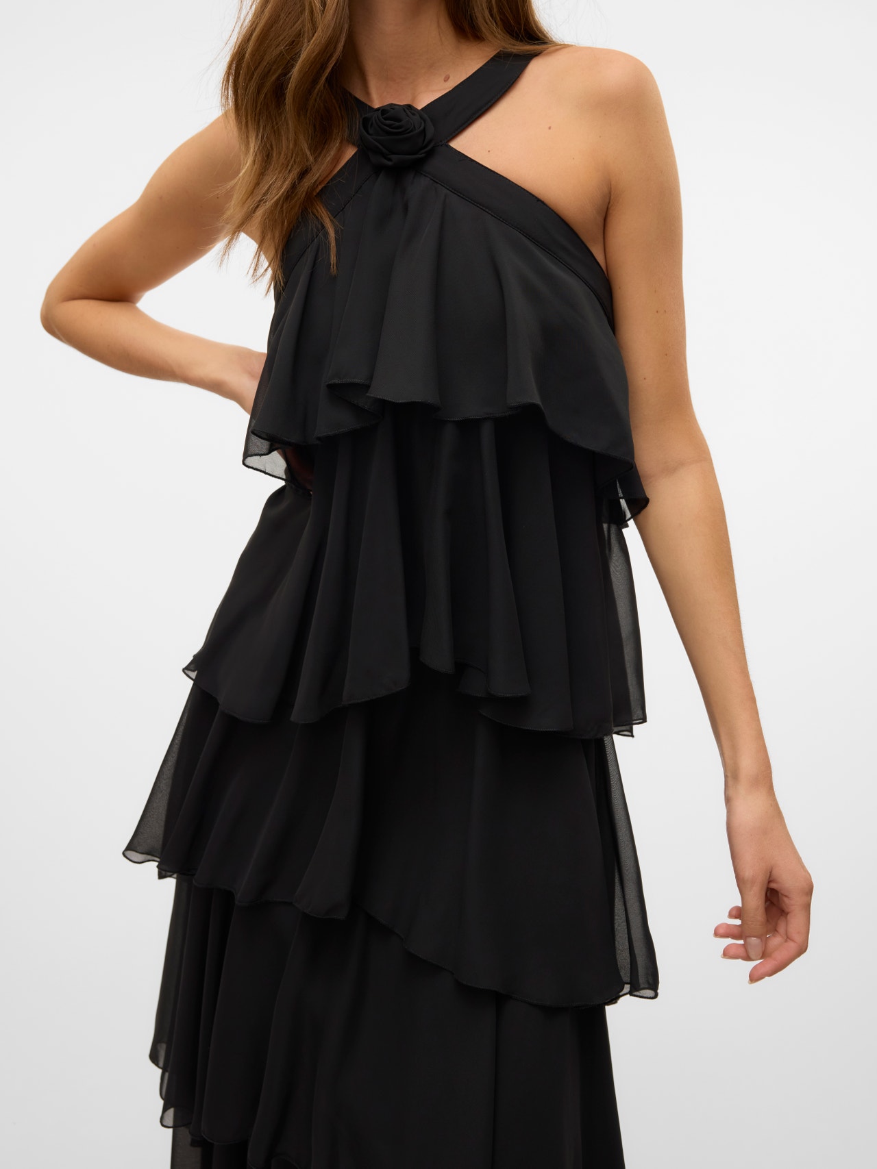 VMFELICIA er en sort maxikjole i regular fit med halterneck. Kjolen er uden ærmer og har en blomsterdetalje ved halsudskæringen. Designet er kendetegnet ved flæser i flere lag ned langs hele kjolens længde, en åben ryg og lukkes med en lynlås.
