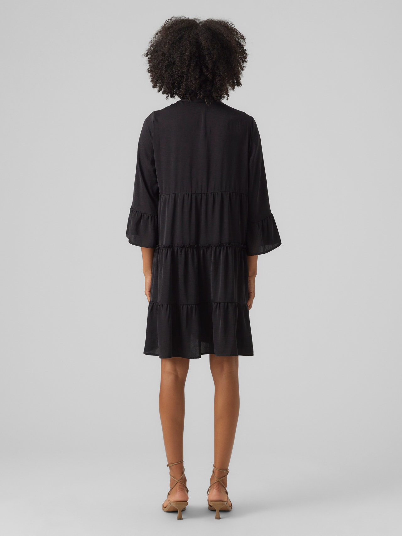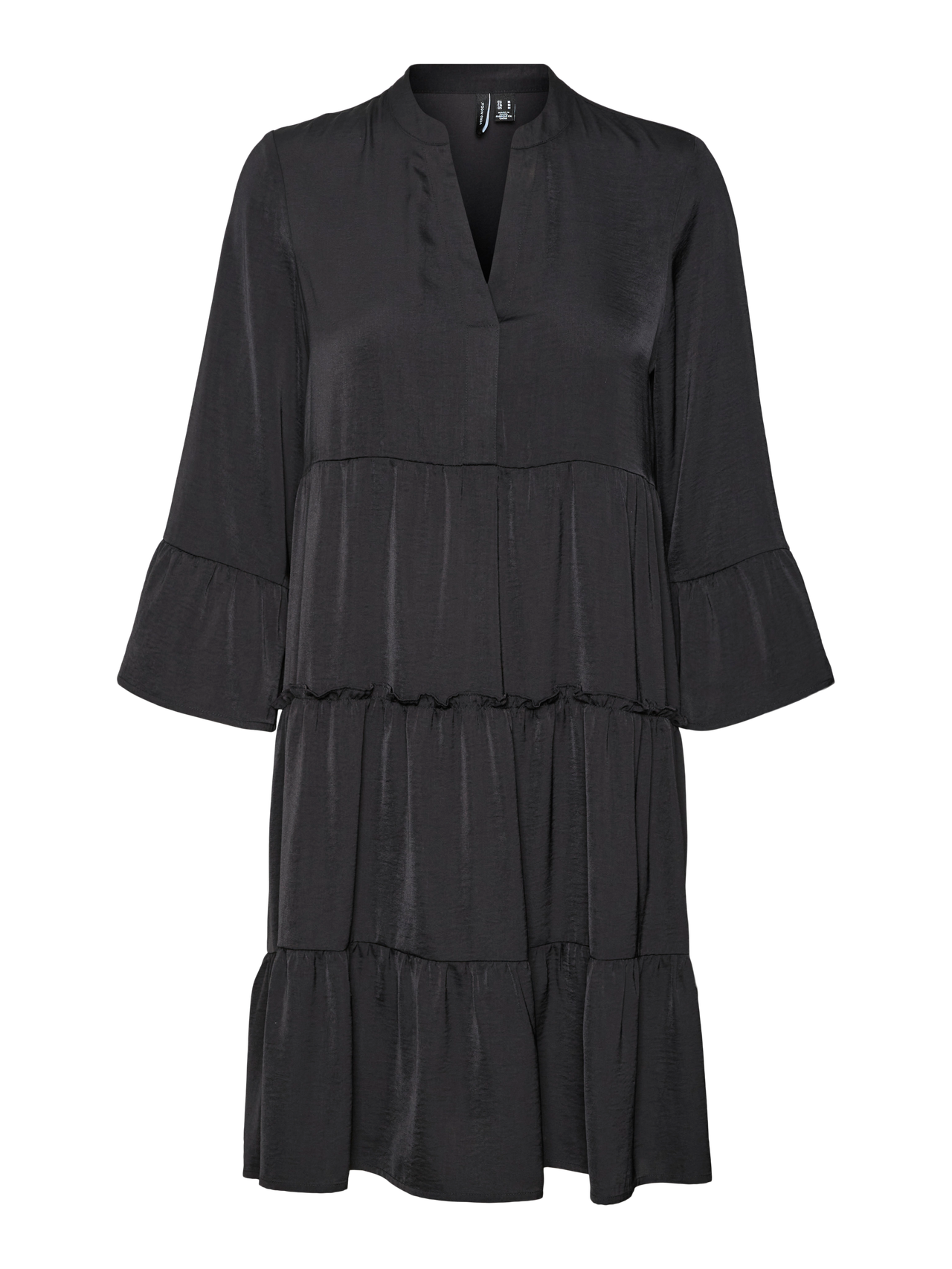 Denne kjole er det perfekte valg til de dage, hvor det virker umuligt at sætte et outfit sammen. Kombinationen af komfort og stil gør denne kjole til en perfekt hverdags-go-to. Gør den finere eller mere afslapper afhængigt af din smag. - Produkttype : Kjole - Hals : V-hals - Ærme : 3/4 ærmer - Ærmer : Brede ærmer - Længde/størrelse : Kort - Detaljer : Skæringslinje i taljen, Flæser - Pasform : Regular fit