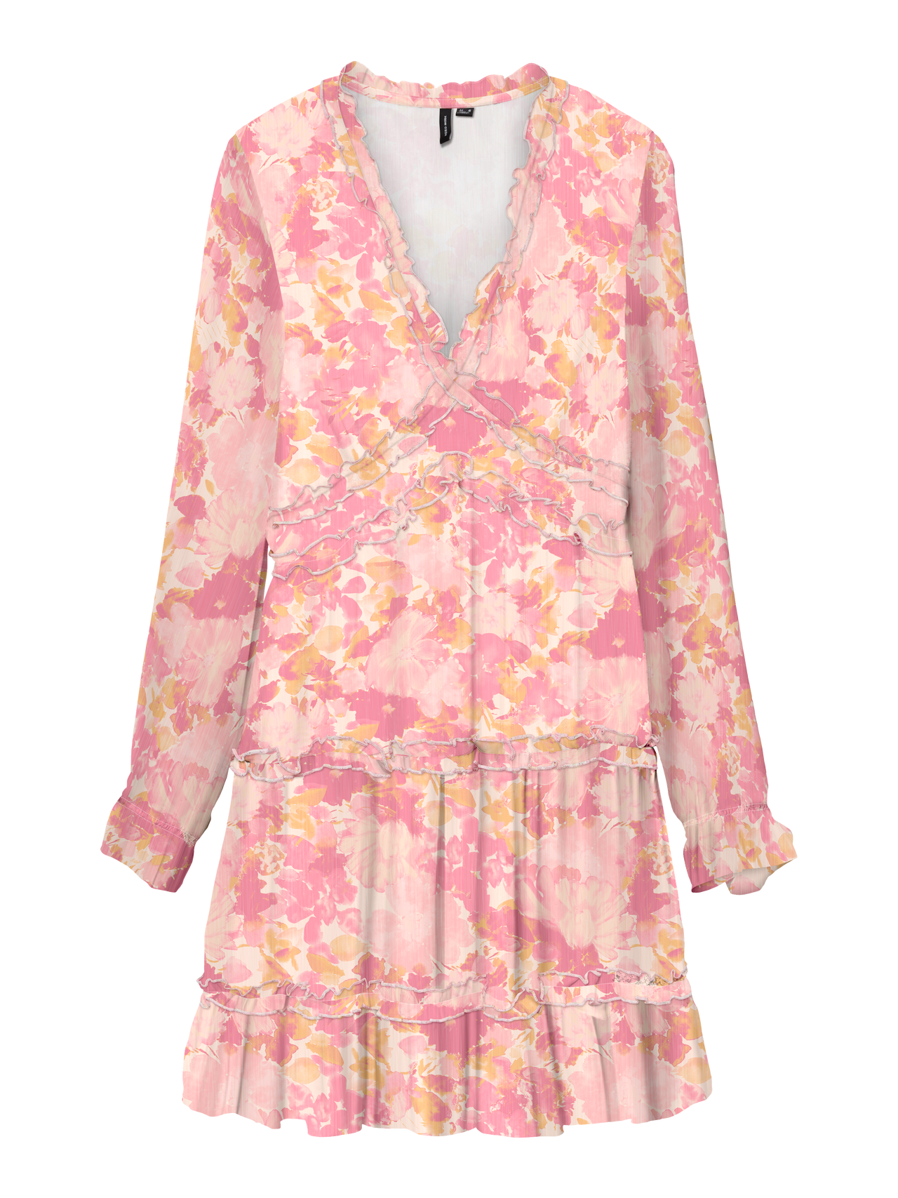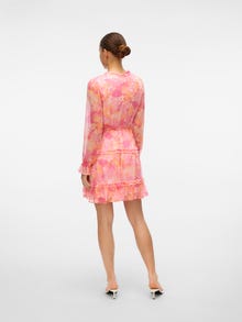 Denne kjole er det perfekte valg til de dage, hvor det virker umuligt at sætte et outfit sammen. Kombinationen af komfort og stil gør denne kjole til en perfekt hverdags-go-to. Gør den finere eller mere afslapper afhængigt af din smag. - Produkttype : Kjole - Hals : V-hals - Ærme : 2/4 ærmer - Ærmer : Volumenærmer - Manchetter : Elastiske manchetter - Længde/størrelse : Kort - For : Polyesterfor for et ikke-transparent look - Detaljer : Flæser - Print : Printet på hele produktets overflade - Pasform : Regular fit