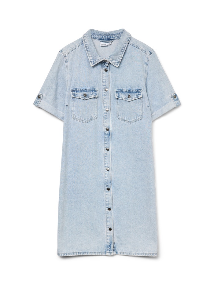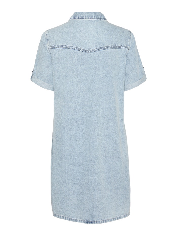 En lyseblå kort denimkjole i regular fit med skjortekrave. Kjolen har korte ærmer med opslag og en gennemgående knaplukning foran.
