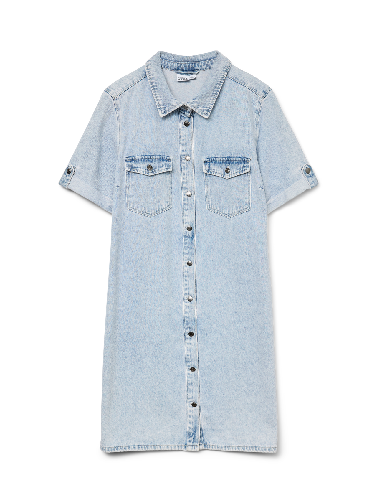 En skjortekjole er både alsidig og stilrigtig. Stilen er et musthave i garderoben. Brug den, som den er eller med et par jeans. Føj et bælte til i taljen for at fremhæve din figur. Denne skjortekjole har uendelige styling-muligheder og er perfekt til dage, hvor du ikke ved, hvad du skal tage på. - Produkttype : Denimkjole - Hals : Skjortekrave - Ærme : Korte ærmer - Lukning : Knaplukning - Lommer : Brystlommer - Længde/størrelse : Kort - Vask/behandling : Acid wash, som giver et ekstra bleget look og en blødere overflade - Pasform : Regular fit