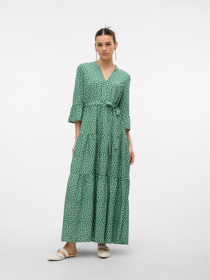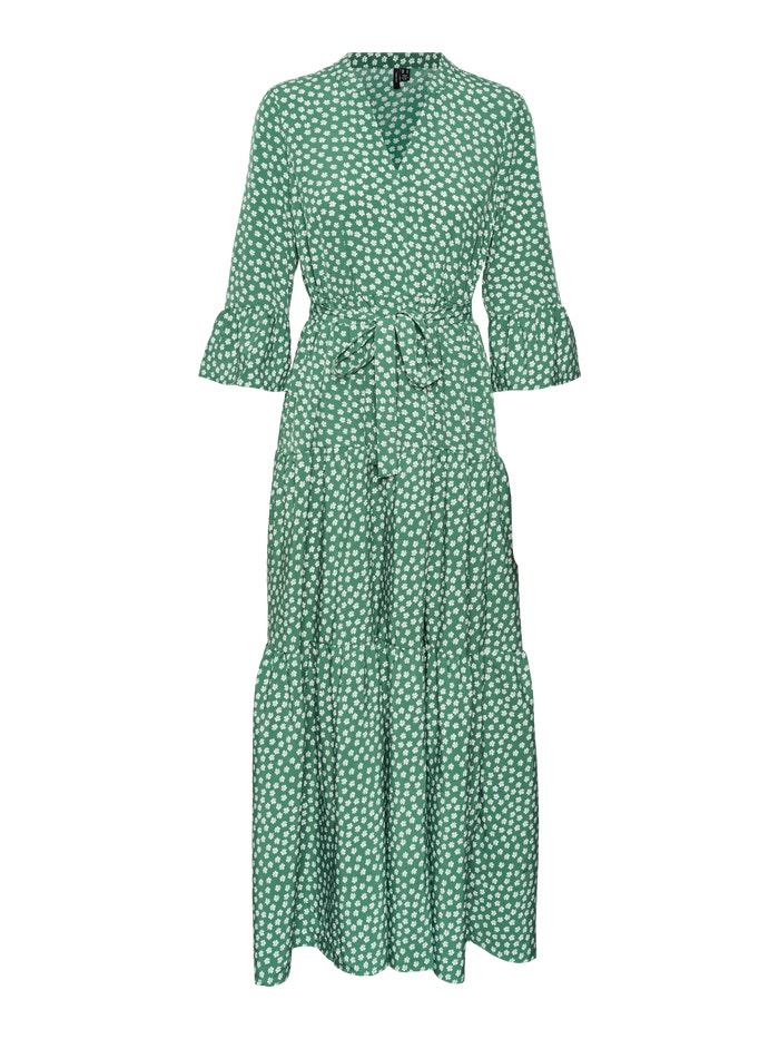En grøn og hvid blomstret maxikjole i regular fit. Kjolen har en V-udskæring med kinakrave og 3/4 brede ærmer, der afsluttes med flæser. Designet inkluderer et bindebånd i taljen og har en lukket ryg.