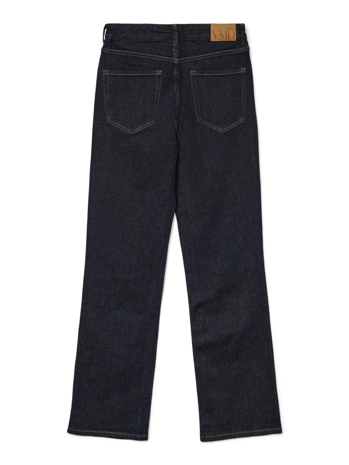 Mørkeblå jeans med høj talje og en lige pasform. Disse jeans er designet med ekstra længde og har klassiske detaljer som bæltestropper samt knap- og lynlåslukning. Materialet består af en bomuldsblanding med genanvendt bomuld og en smule elastan for nødvendig strækbarhed.
