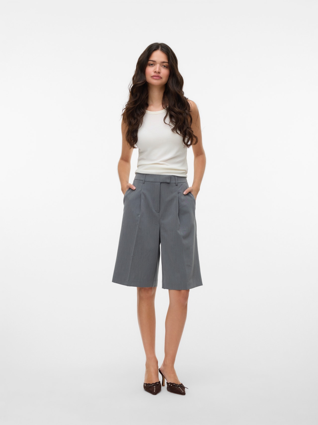 Din nye foretrukne sommer-underdel vil uden tvivl være et par lange shorts. Den ekstralængde giver dit look et maskulint touch. Brug dem med et par højhælede og din yndlingsblazer for at få et ubesværet festlook. - Produkttype : Bermudashorts - Lukning : Krog og øjelukning med lynlås - Lommer : Sidelommer - Talje : Høj talje - Længde/størrelse : Knælængde - Pasform : Regular fit