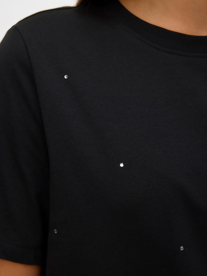 VMPAULINA t-shirt er en sort t-shirt med en normal pasform. T-shirten har et prikket mønster. Den har korte ærmer og en rund halsudskæring. Designet er kendetegnet ved små pailletter og perler, der er fordelt på fronten.