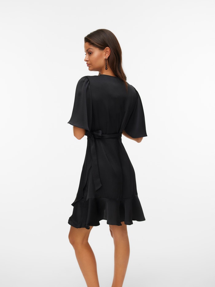 En sort minikjole i regular fit med V-udskæring. Kjolen har korte, brede ærmer og er designet som en slå-om kjole.