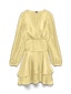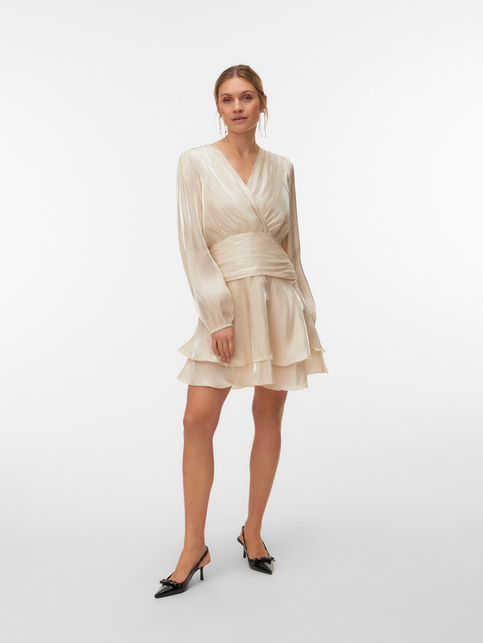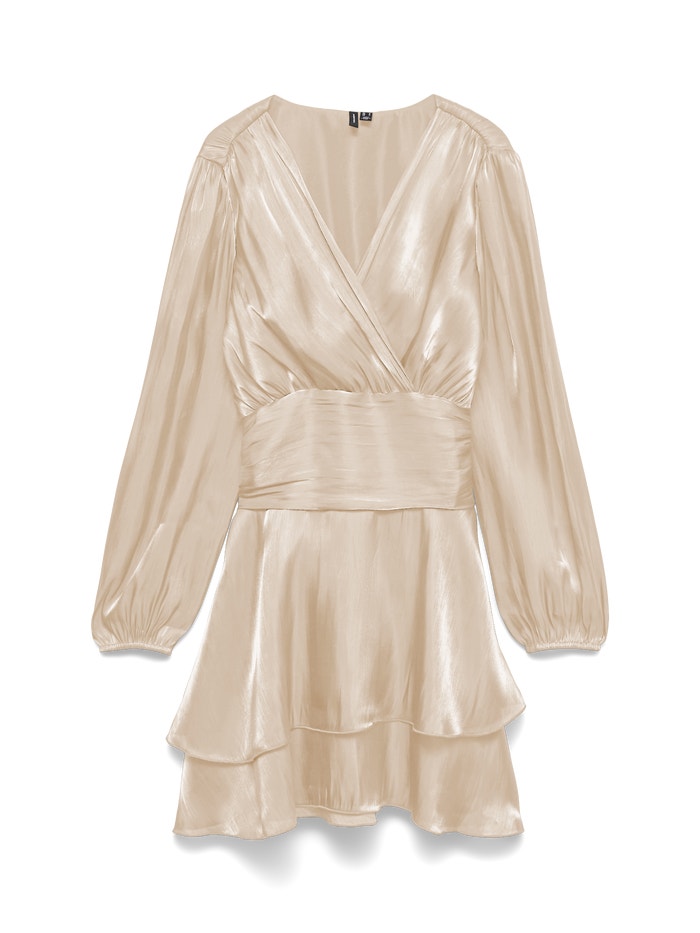 En beige minikjole i satin med regular fit og V-udskæring. Kjolen har lange pufærmer med elastikkant ved manchetterne og en skæring i taljen.