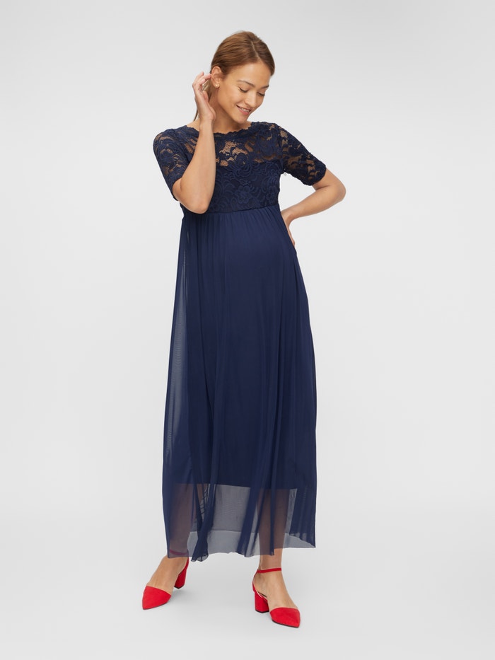 LADIES MATERNITY A-SHAPE DRESS. 2/4LACE SLEEVES WITHOUT LINING WITH SCALLOP EDGE. BOAT NECK WITH LACE EDGE. LINING AT SKIRT AND HALF OF UPPER BODY. CUTLINE ABOVE BELLY AND GATHERINGS BELOW CUTLINE. ZIPPER AT SIDESEAM. WITH SATIN WEAVE BELT.