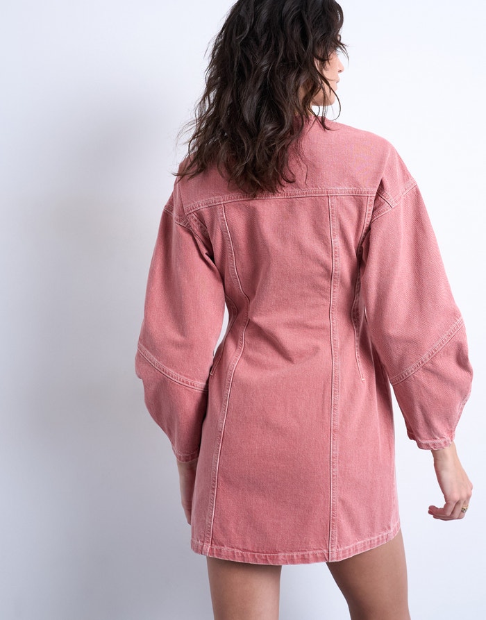 En lyserød denimkjole fra TOPSHOP med kinakrave og regular fit. Kjolen har lange, vide ærmer og lukkes med en gennemgående knaplukning foran. Den er designet med brystlommer med knaplukning og har en lukket ryg.