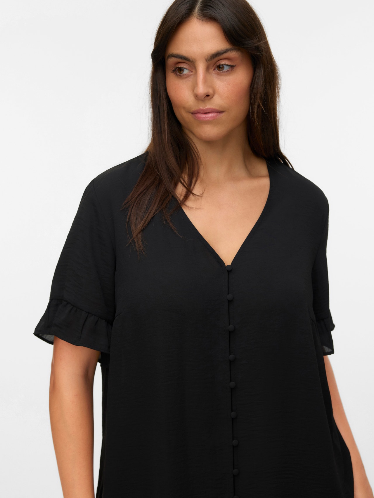 Blusen sind die vielseitigsten Teile in deinem Kleiderschrank. Du kannst sie zu fast allem tragen, von Jeans über Hosen bis hin zu Röcken. Und unsere Styles sind da keine Ausnahme. Dieser Style verleiht deinem Look im Handumdrehen mehr Eleganz. Curve-Styles sind so designt, dass sie kurvigen Frauen perfekt passen.. - Produkttyp : Bluse - Hals : V-Ausschnitt - Ärmel : Halbarm - Ärmel : Weite Ärmel - Manschetten : Ärmelbündchen mit Rüschen - Verschluss : Knopfleiste - Details : Rüschen - Passform : Normal geschnitten - Lebensstil : Freizeit