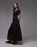 Topshop cap sleeve shirred dress with tie sides in brown with contrast black ties - BRONZE