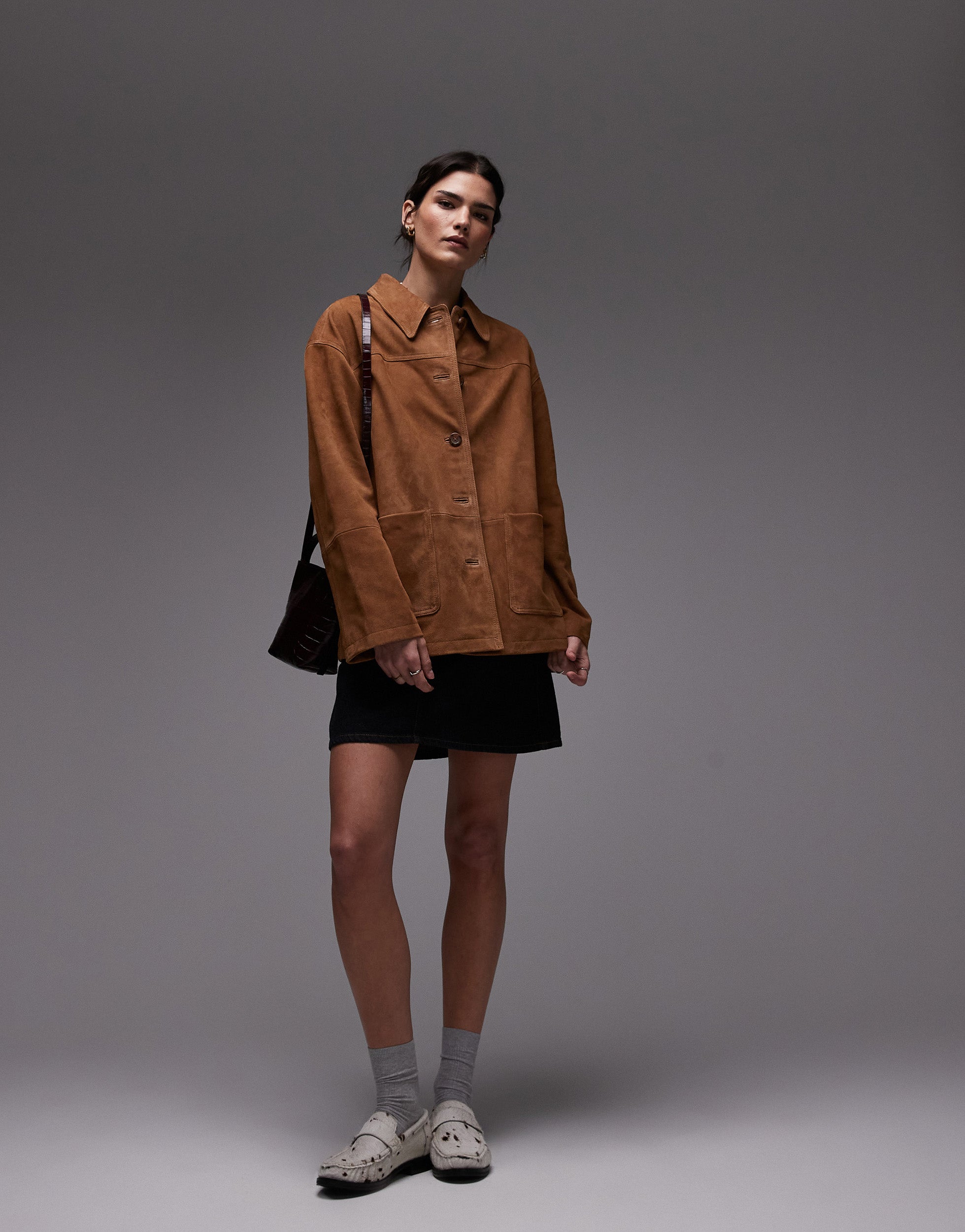 Topshop premium real suede patch pocket boxy jacket in tan - TAN