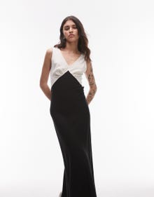 Topshop deep v contrast linen midi dress in black - BLACK