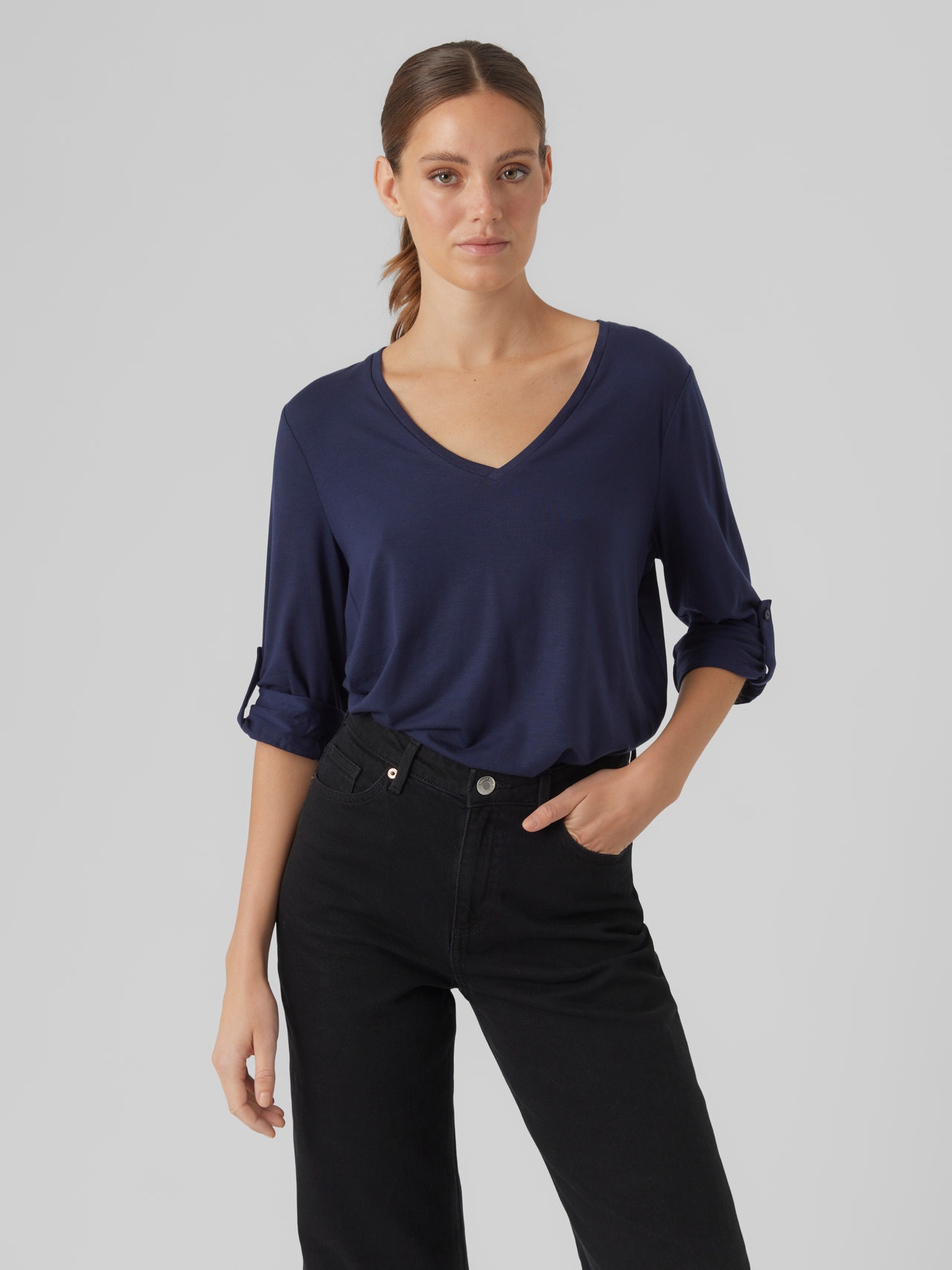 Basics finden sich in jedem Kleiderschrank. Unsere Basic-Oberteile sind das verbindende Element für ein Outfit – und dieses Oberteil ist da keine Ausnahme. Style es mit einer Hemdjacke, einer bequemen Mom Jeans und Chunky Stiefeln zu einem lässigen und coolen Alltagslook.