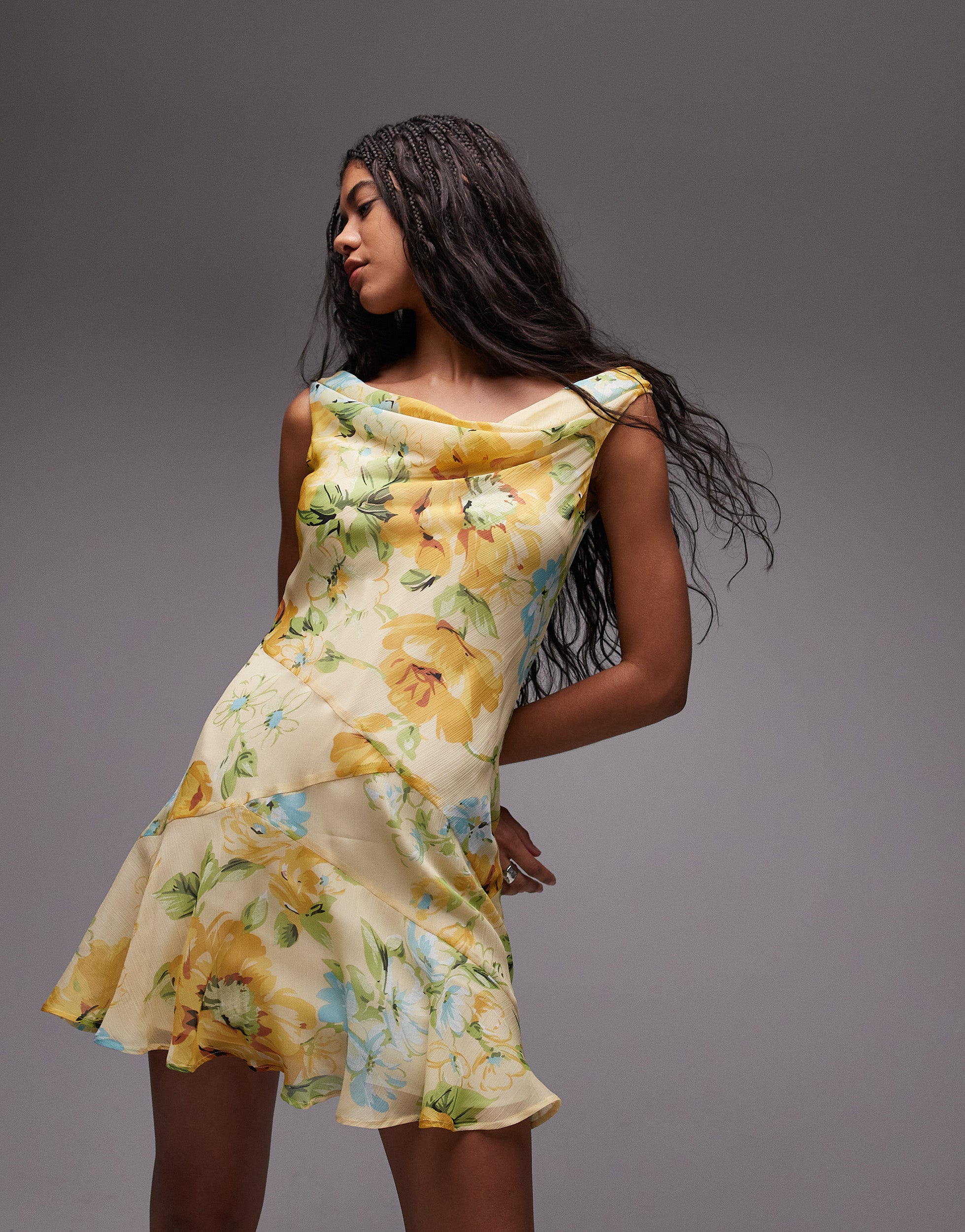 Topshop cowl neck full hem mini tea dress in lemon floral - YELLOW