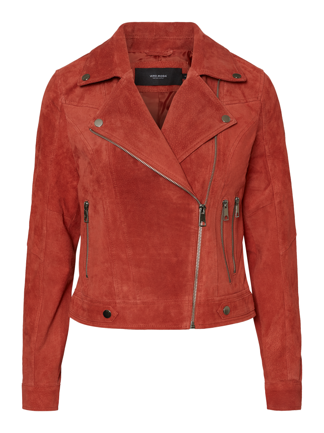 Short suede jacket with asymmetrical fastening, zip closure and press button details. The jacket also has two pockets with zip closure. Style the jacket with jeans and chunky boots.