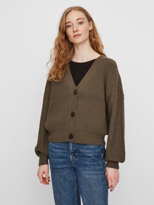 Chunky knitted cardigan with voluminous sleeves and button closure in the front. The cardigan looks great with a feminine top and a pair of jeans.