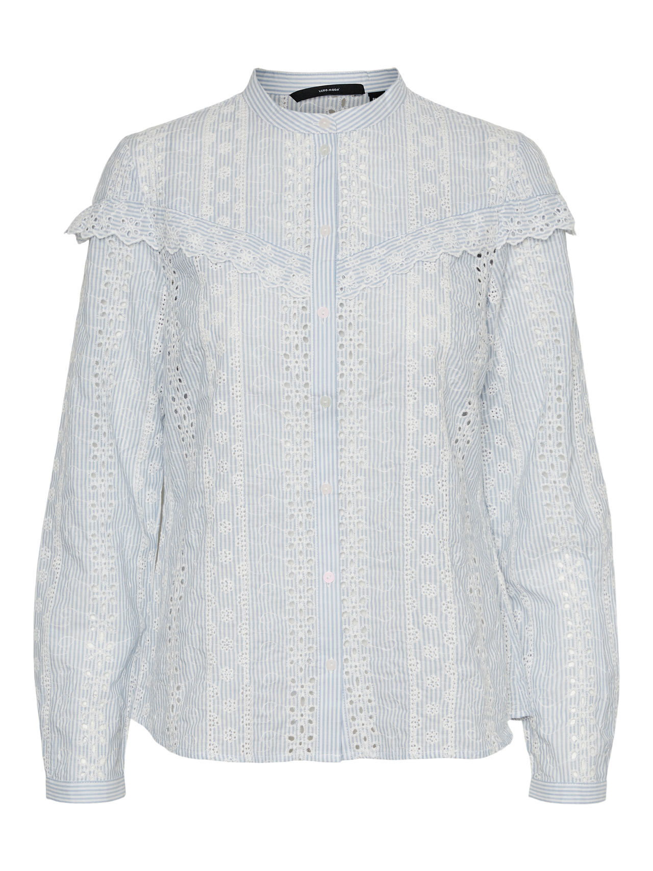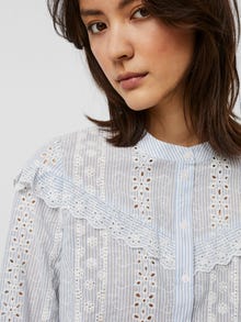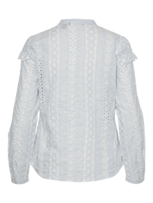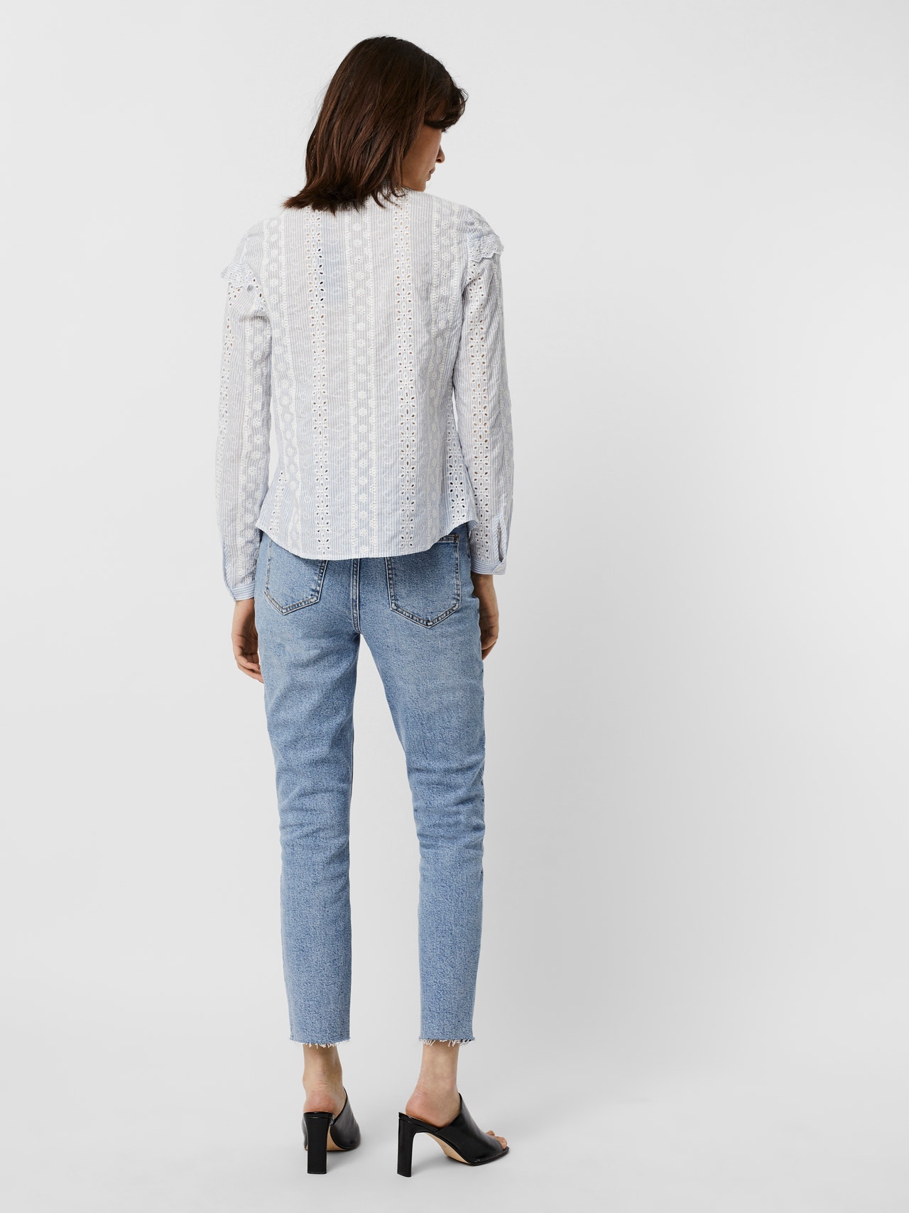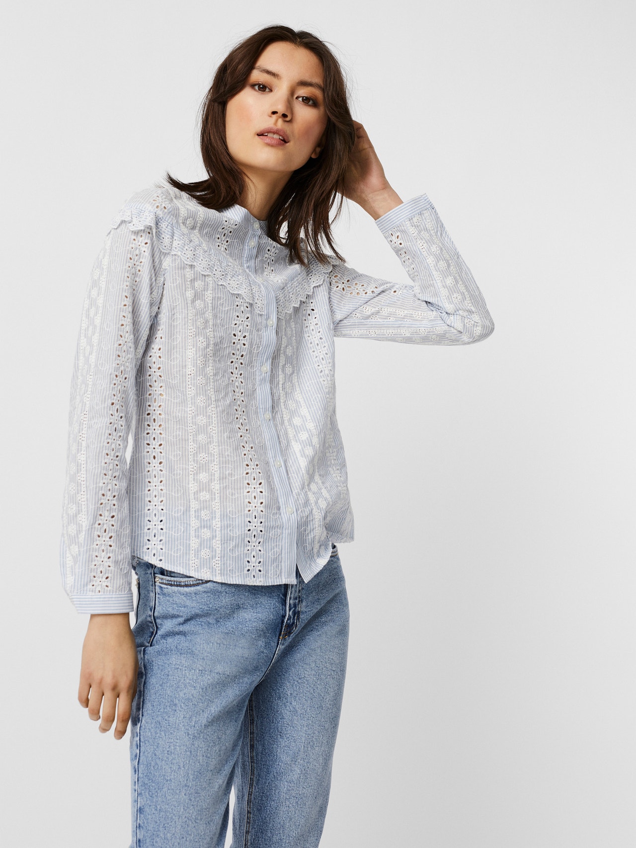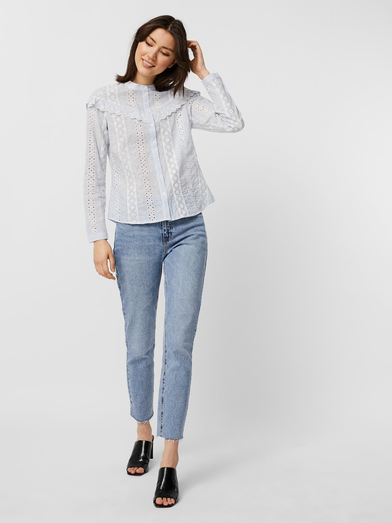 - Bestickte Bluse mit Rüschendetails - Knopfverschluss - Gestickte Details - Rüschendetails an den Schultern - Regular Fit - Vordere Länge: 64 cm in Größe S - Das Model ist 175 cm groß und trägt Größe S Bestickte Bluse mit Rüschendetails und Knopfverschluss. Diese feminine Bluse ist die perfekte Wahl für die Tage, an denen du deine süße Seite ausleben möchtest. Dazu passen Jeans und Stiefel oder Sandalen mit Absatz.