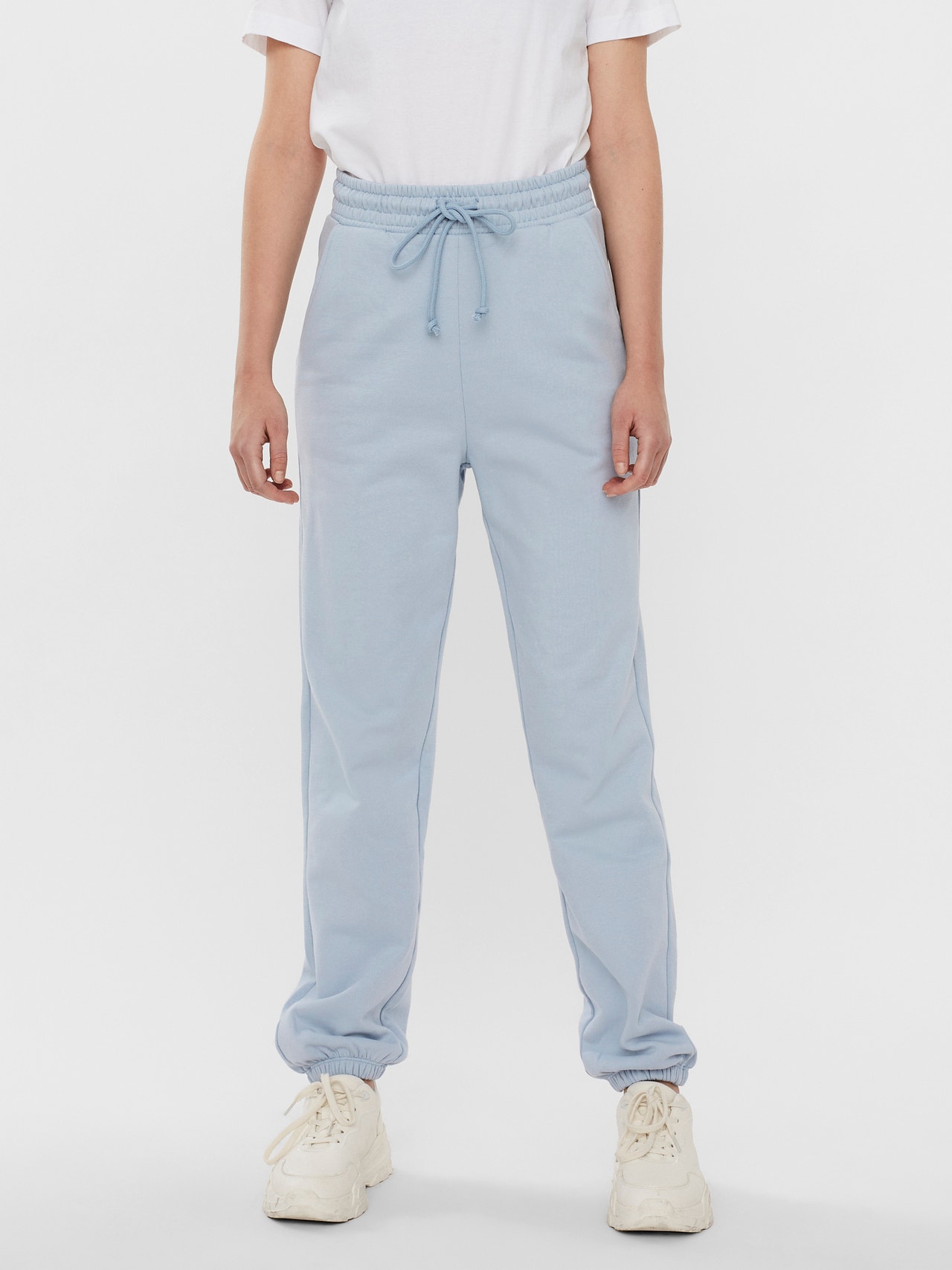 Sweatpants with high waist and slit pockets. The sweatpants also have elastic at the waist and ankles. Style them with a matching sweatshirt for a casual look.