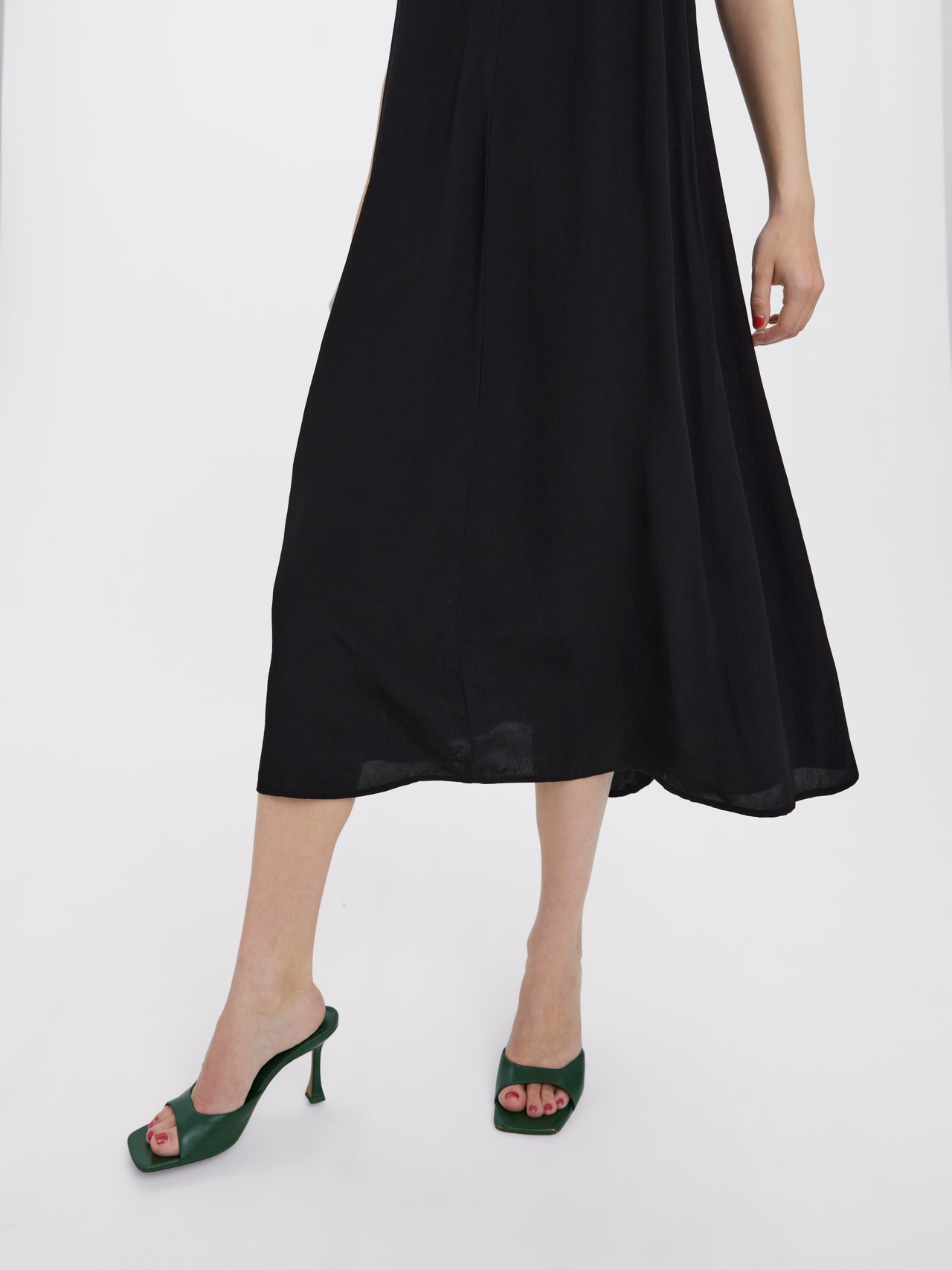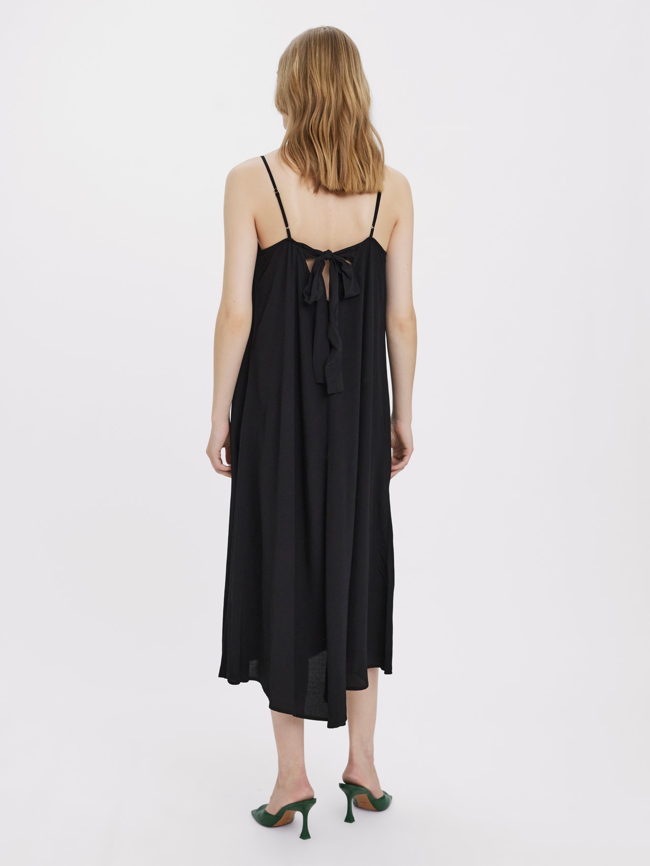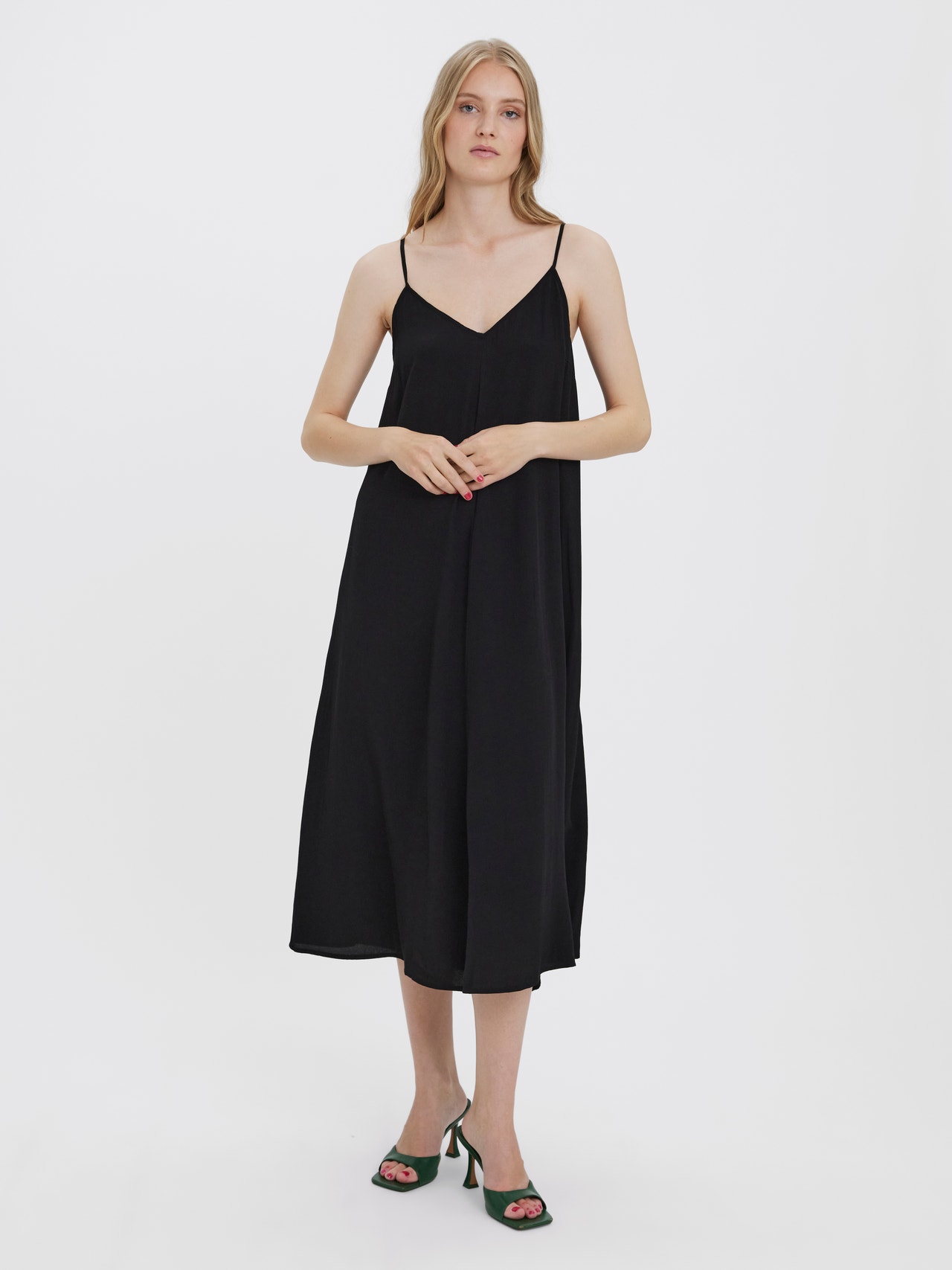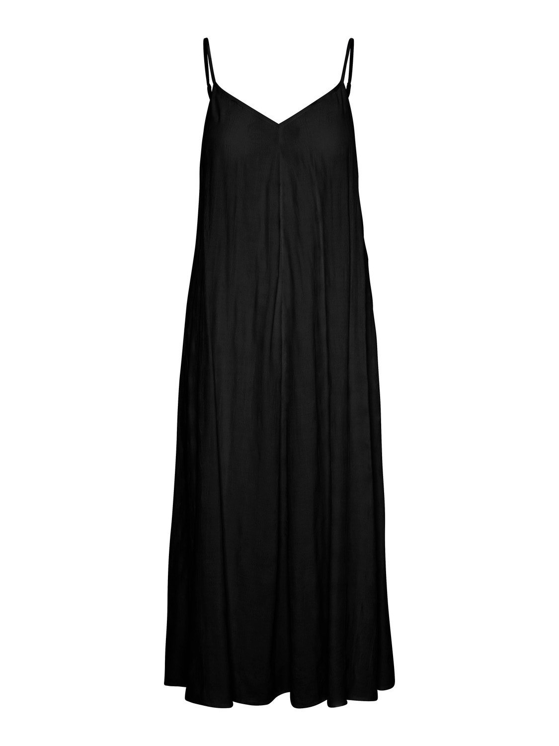 Singlet dress with a floaty look, thin and adjustable shoulder straps, and a V-neck. Style this stunning dress with some heeled sandals for a sophisticated and beautiful look.