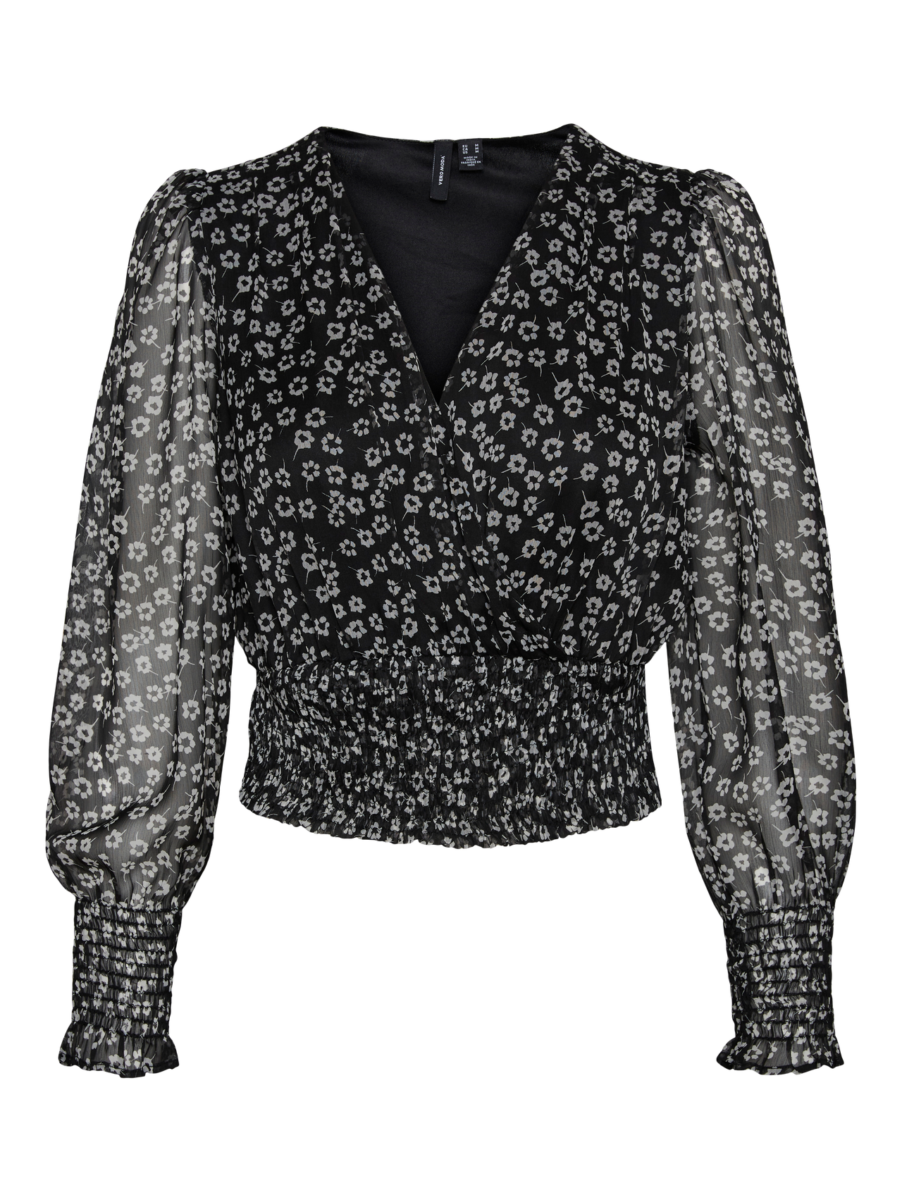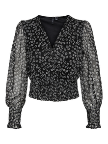 LDS WOVEN L/S CROPPED TOP WITH FAKE WRAP AND SMOCK AT BOTTOM EDGE.