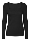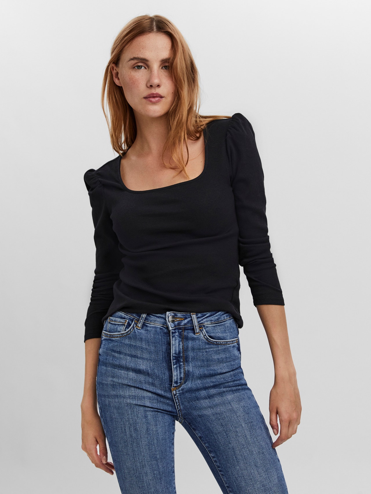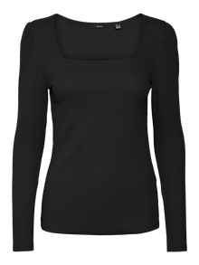 Long-sleeved t-shirt with a square neckline and puffy shoulders. Style this feminine t-shirt with some skinny jeans and some heeled boots for a chic everyday look.