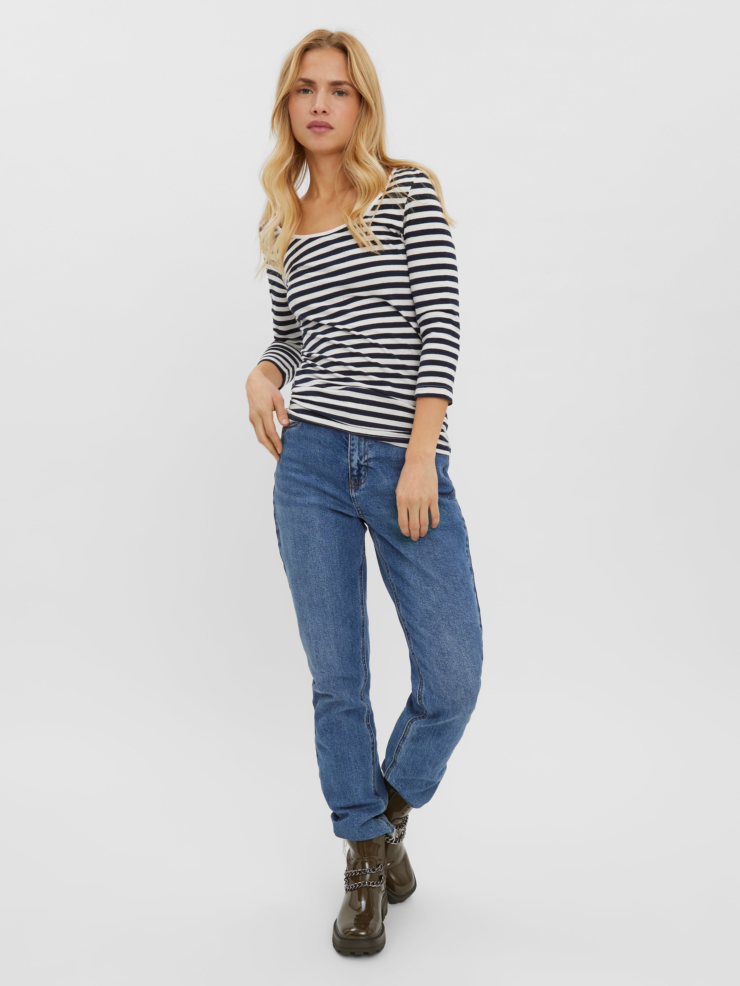 Casual top with a u-neck and 3/4 sleeves in a slim fit. Style this cute top with a pair of loose fit jeans and your favourite chunky boots for a cool, go-to look.