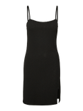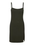 Short, singlet dress with thin, adjustable shoulder straps, a slit on the side, and a deep neckline. Style this cute dress with some chunky boots and a simple t-shirt underneath for a layered and cute everyday look that can easily be dressed up and down.
