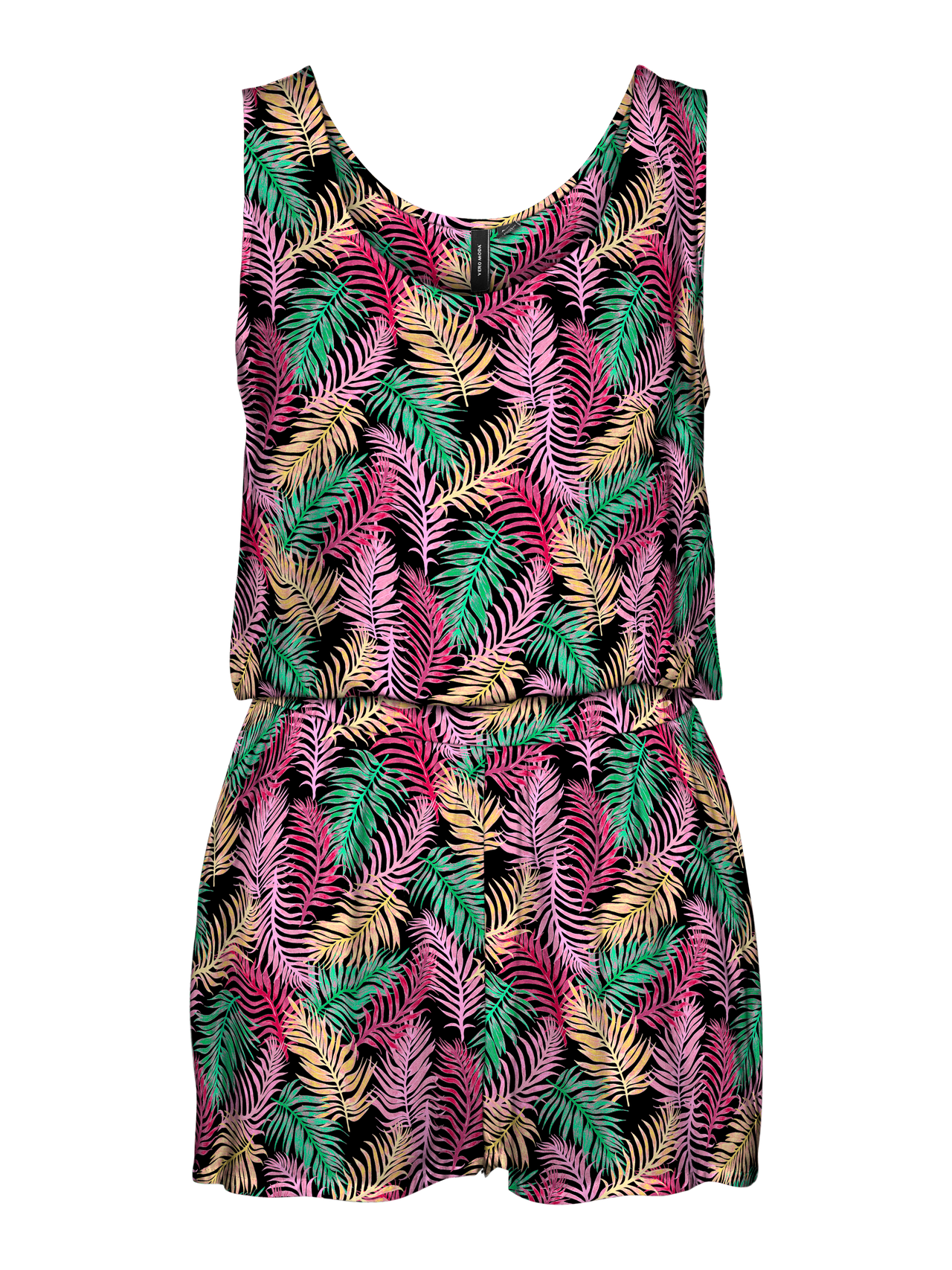 Sleeveless playsuit with a round neckline, elastic waist, and wide straps. Style this playsuit with a pair of heeled boots and a blazer for a stylish look.