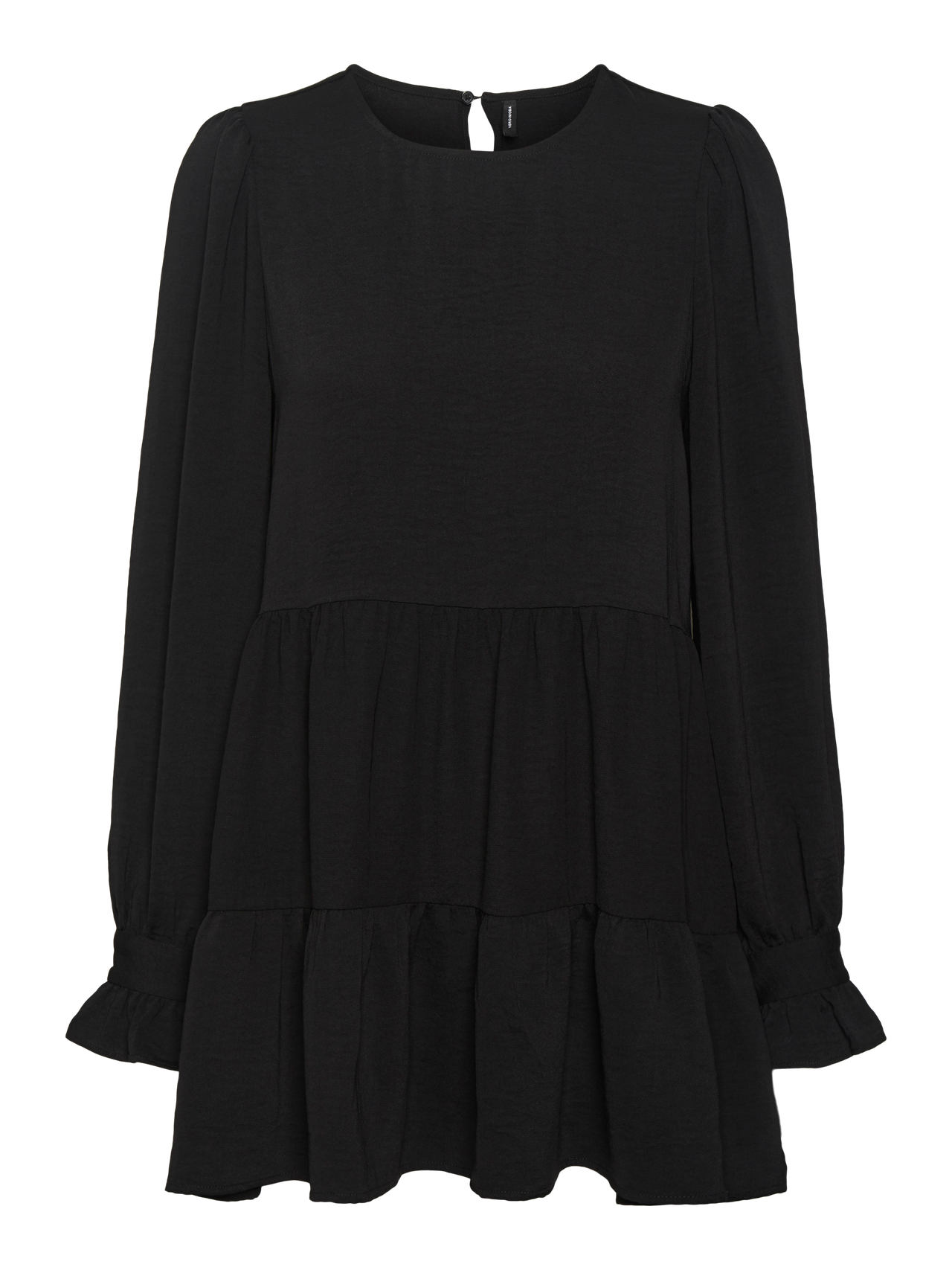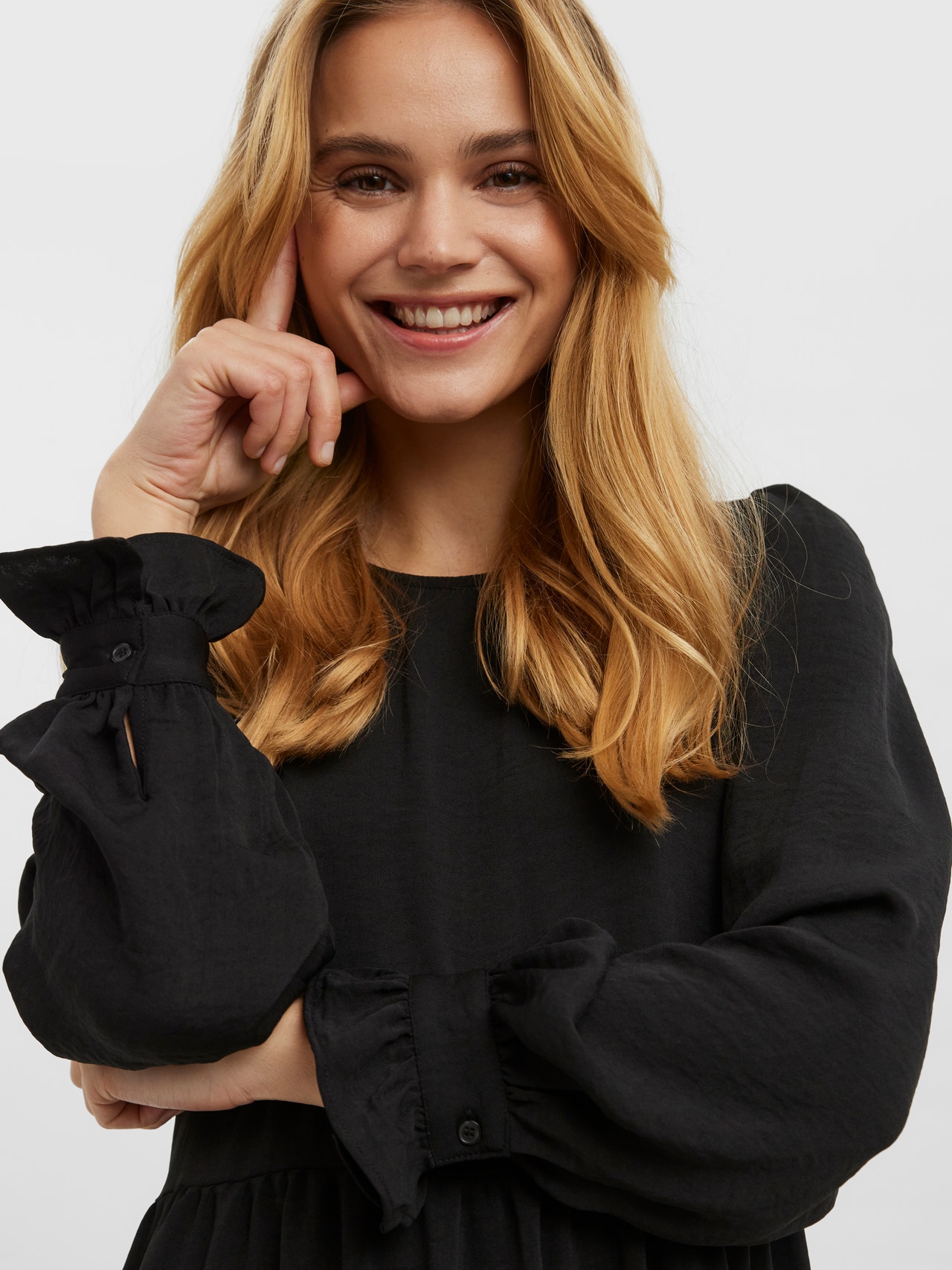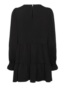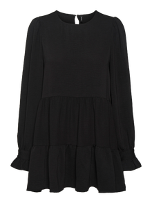 Langarmkleid mit Schößchen, Rüschen an den Ärmelbündchen, Rundhalsausschnitt und Puffeffekt an den Schultern. Kombiniere dieses süße Kleid mit langen Stiefeln und einem Chunky Stirnband zu einem stylishen Look.