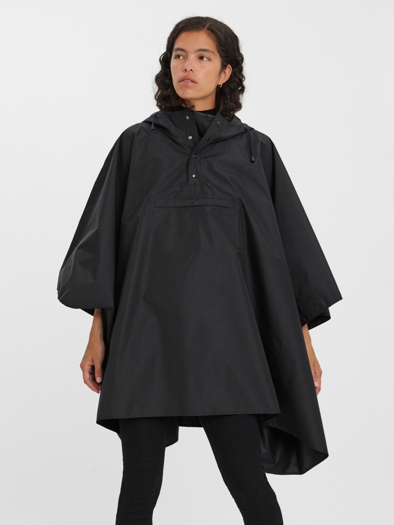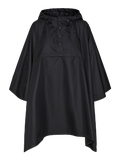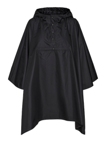 Rain cape with drawstrings by the hood, a high neck, and a big front pocket. Style this cool cape with a pair of jeans and some chunky boots for a gorgeous look on a rainy day.