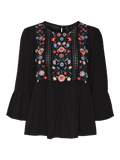 Detailed top with a round neckline, embroidery details, and a keyhole closure at the back. Style this stunning top with a skirt and a pair of cowboy boots for a stylish look.