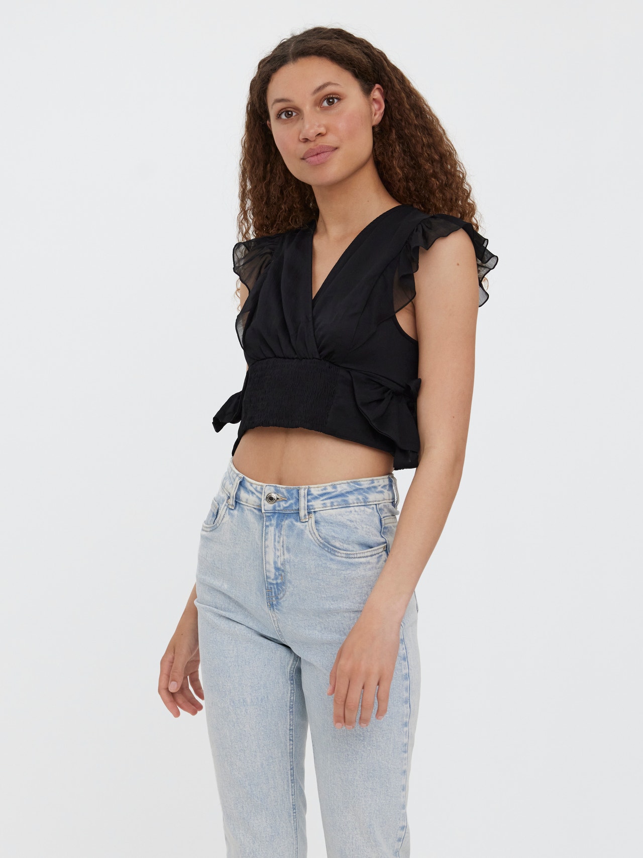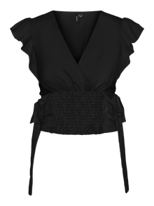 Detailed top with bow details at the waist, frills by the shoulders, and smock at the waist. Style this lovely top with a pair of jeans and some heeled slippers for a stylish look.