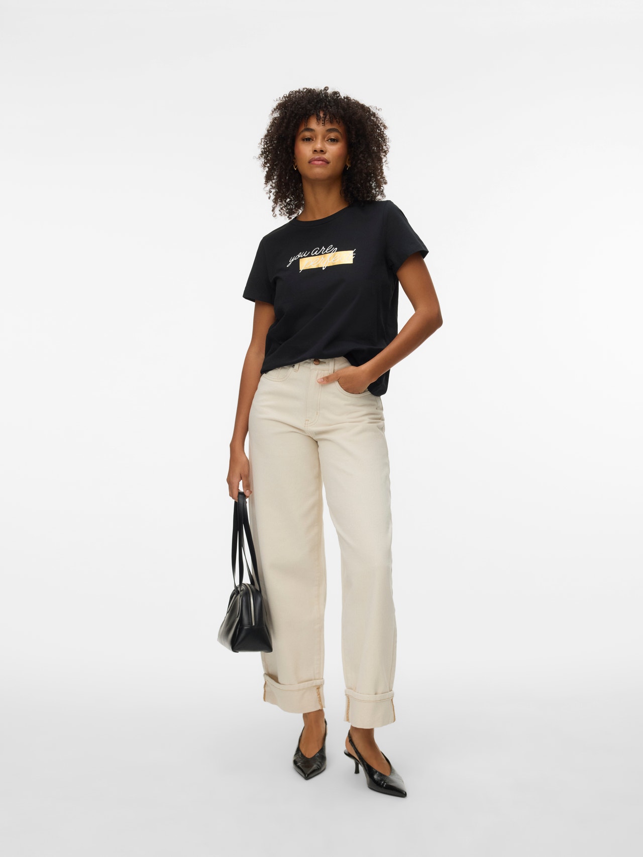 Im Zweifelsfall ein T-Shirt tragen! Mit einem T-Shirt können Sie nie etwas falsch machen - eine perfekte Wahl für einen coolen und zeitlosen Look. Tragen Sie dieses T-Shirt zu einer schönen Boyfriend-Jeans und fügen Sie ein Paar klobige Sneaker für einen urbanen City-Look hinzu.