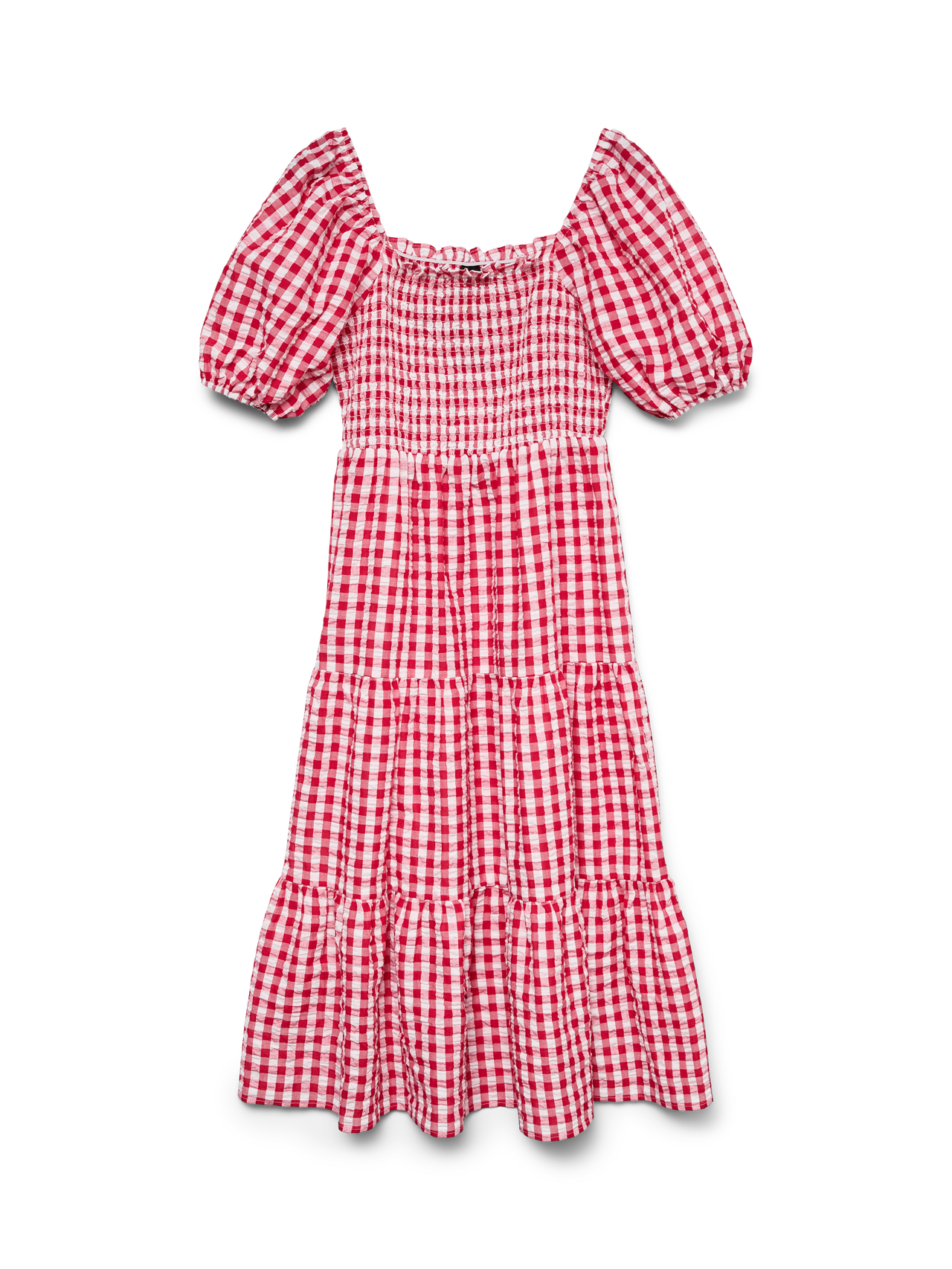 Ein Maxikleid lässt dich nie im Stich. Maxikleider wirken sowohl elegant als auch feminin – und dieses Kleid ist da keine Ausnahme. Style es mit flachen Sandalen zu einem leichten und luftigen Sommerlook oder kombiniere es mit Absatzpumps zu einem trendigen Abendlook. - Produkttyp : Kleid - Hals : Trapezausschnitt - Ärmel : Halbarm - Ärmel : Puffärmel - Manschetten : Elastische Bündchen - Länge/Größe : Wadenlänge - Details : Gesmoktes Detail - Print : Der Druck wiederholt sich auf der gesamten Oberfläche des Produkts - Passform : Normal geschnitten - Lebensstil : Strand, Fest
