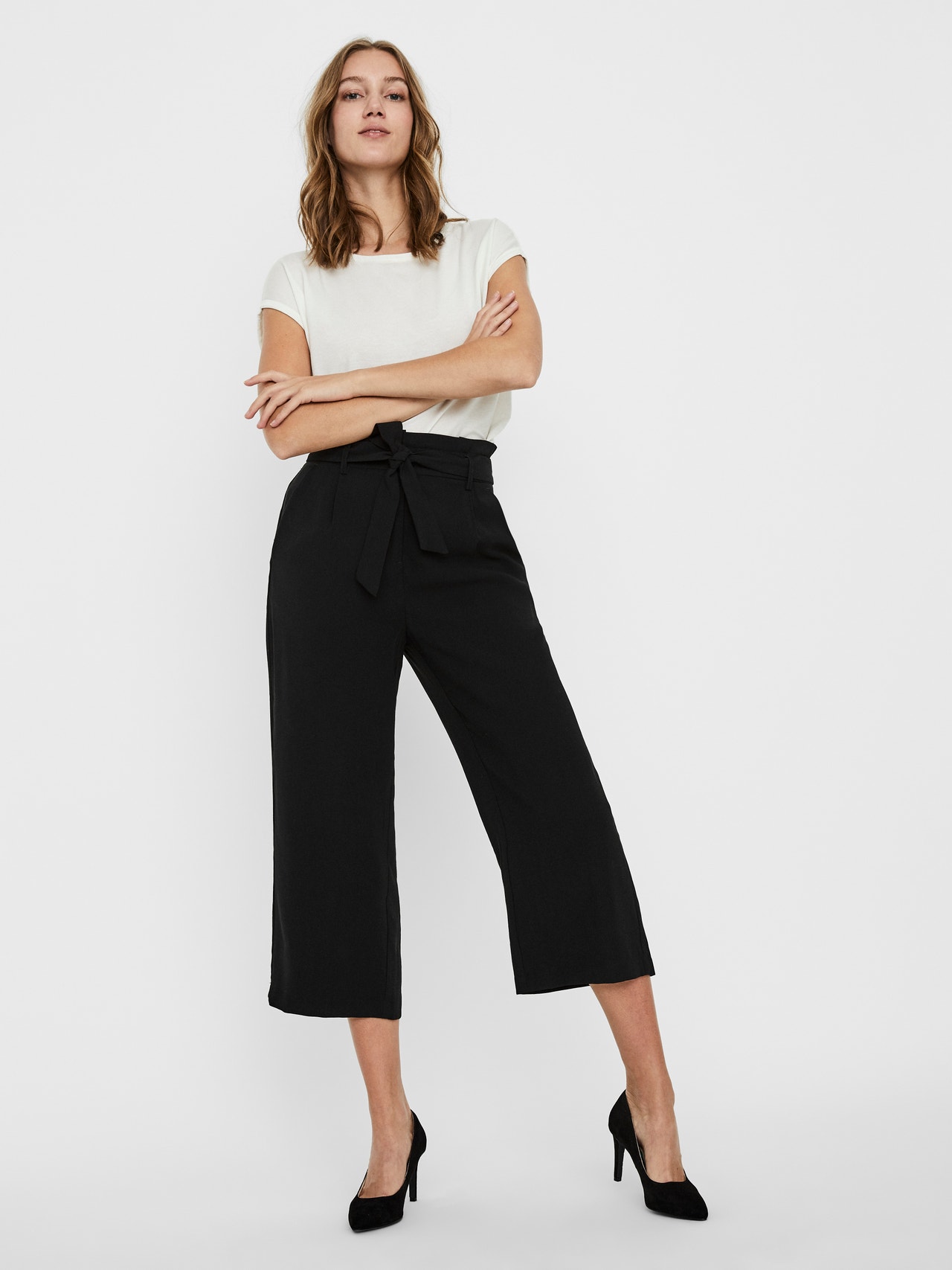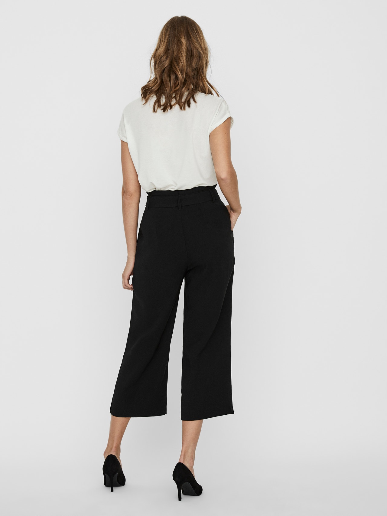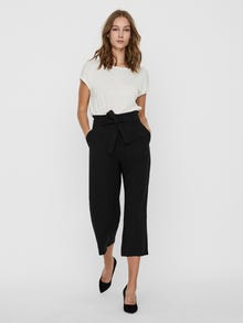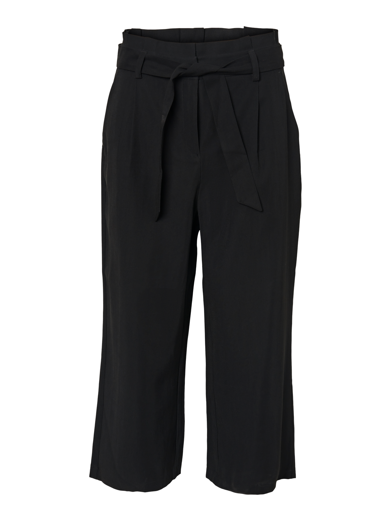 Culotte trousers with high waist, slit pockets and a wrap belt at the waist. Style the trousers with a feminine top and a matching blazer.