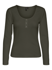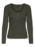 Top with button details and ribbed structure. The top is made from an organic cotton material. Wear it with a faux leather skirt for a trendy look.