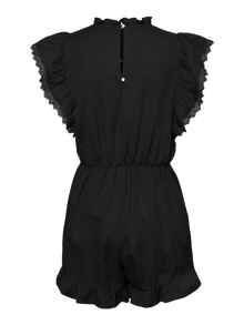 LDS. WOVEN. S/L PLAYSUIT WITH ELASTIC AT THE WAIST AND FRILLS AROUND THE SLEEVES AND NECKLINE. KEYHOLE AT THE BACK AND EMB. DETAILS AT THE FRONT.