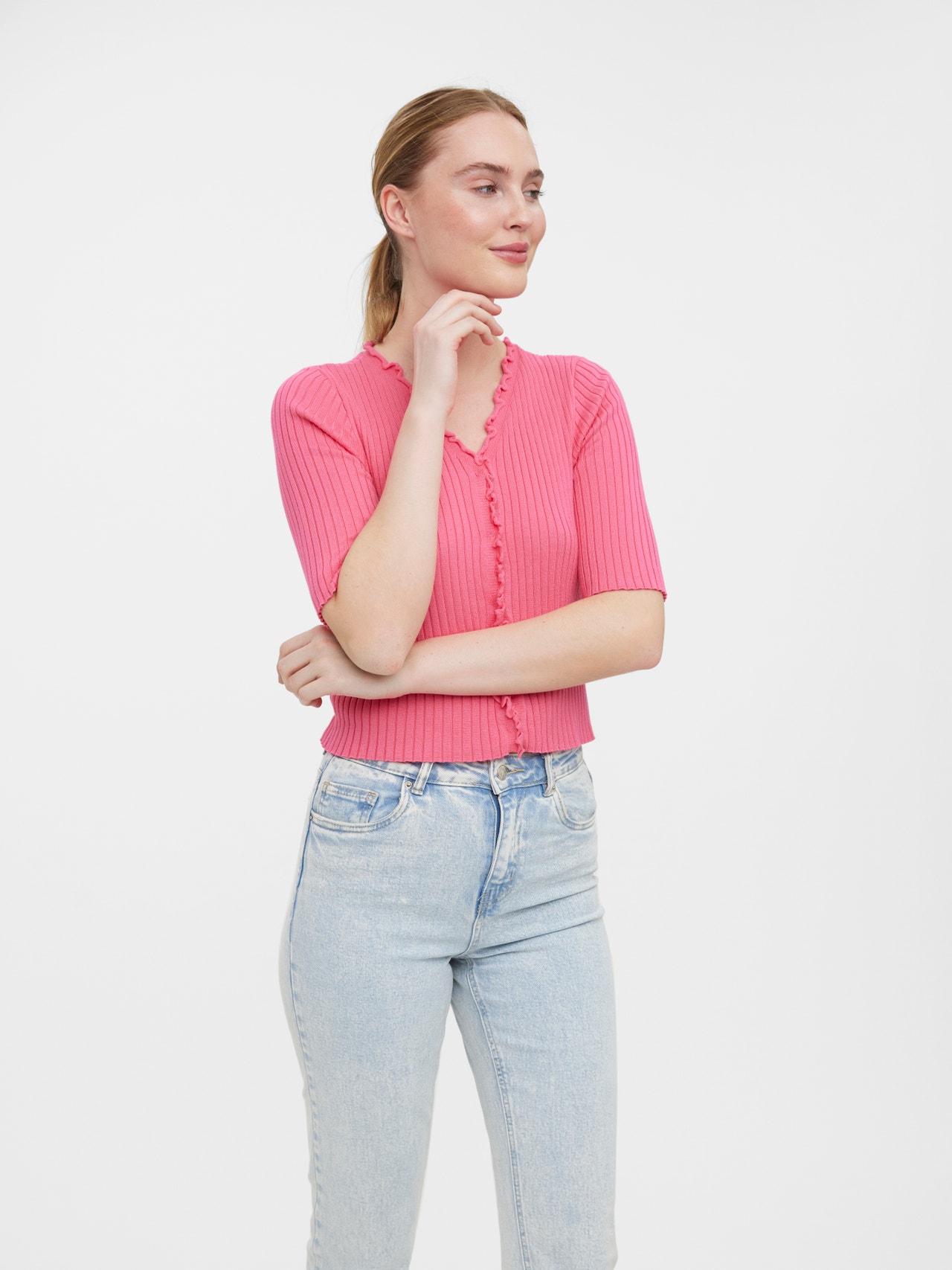 Knitted cardigan with a V-neck, 2/4 sleeves, and a ribbed structure. Style this gorgeous cardigan with a mini skirt and a pair of long boots for a stunning look.