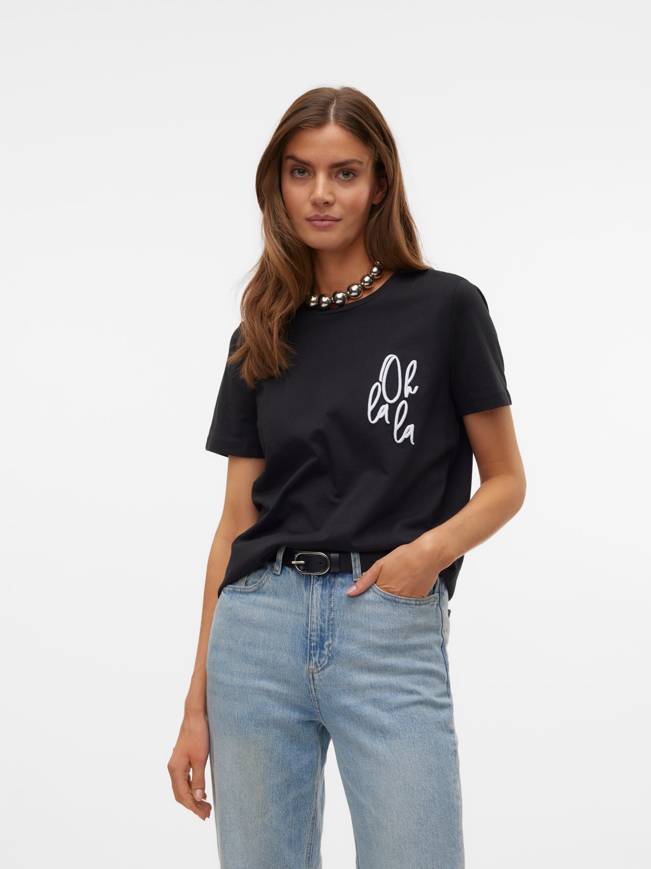 When in doubt, wear a T-shirt! You can never go wrong with a T-shirt - a perfect choice for a cool and timeless look. Wear this T-shirt with nice boyfriend jeans and add a pair of chunky sneakers for an urban city look.