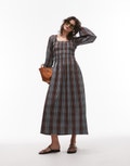 Topshop shirred long sleeve midi dress in blue vintage check - MBLUE