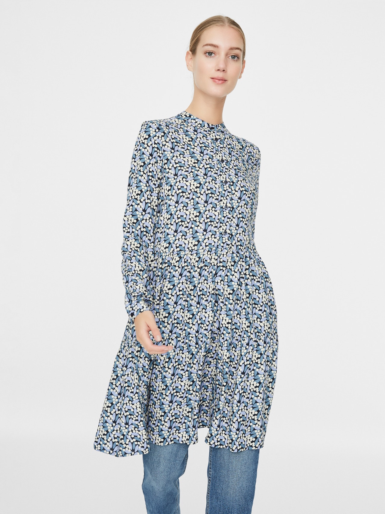 Mini dress with button closure and button details at the cuffs. Style the dress with skinny jeans and boots for an elegant everyday look.