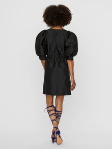 Mini dress with voluminous sleeves, an elastic waistband and a keyhole in the back. Wear the dress with high heels for a fun and feminine silhouette.